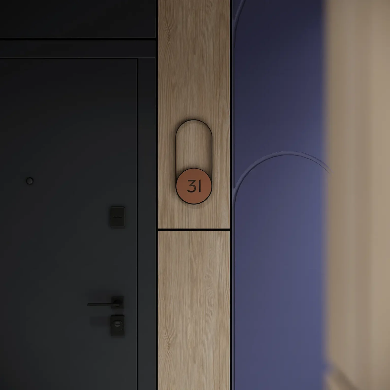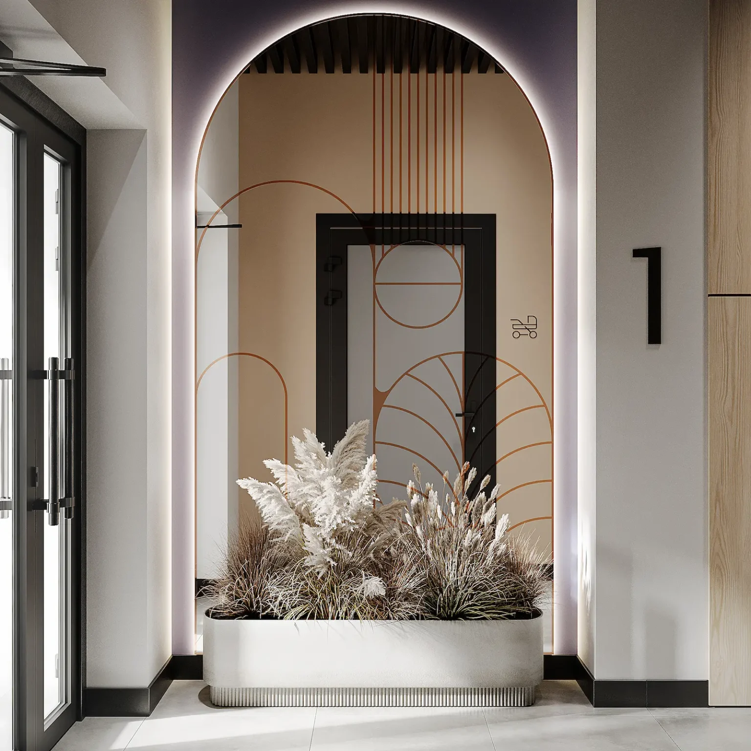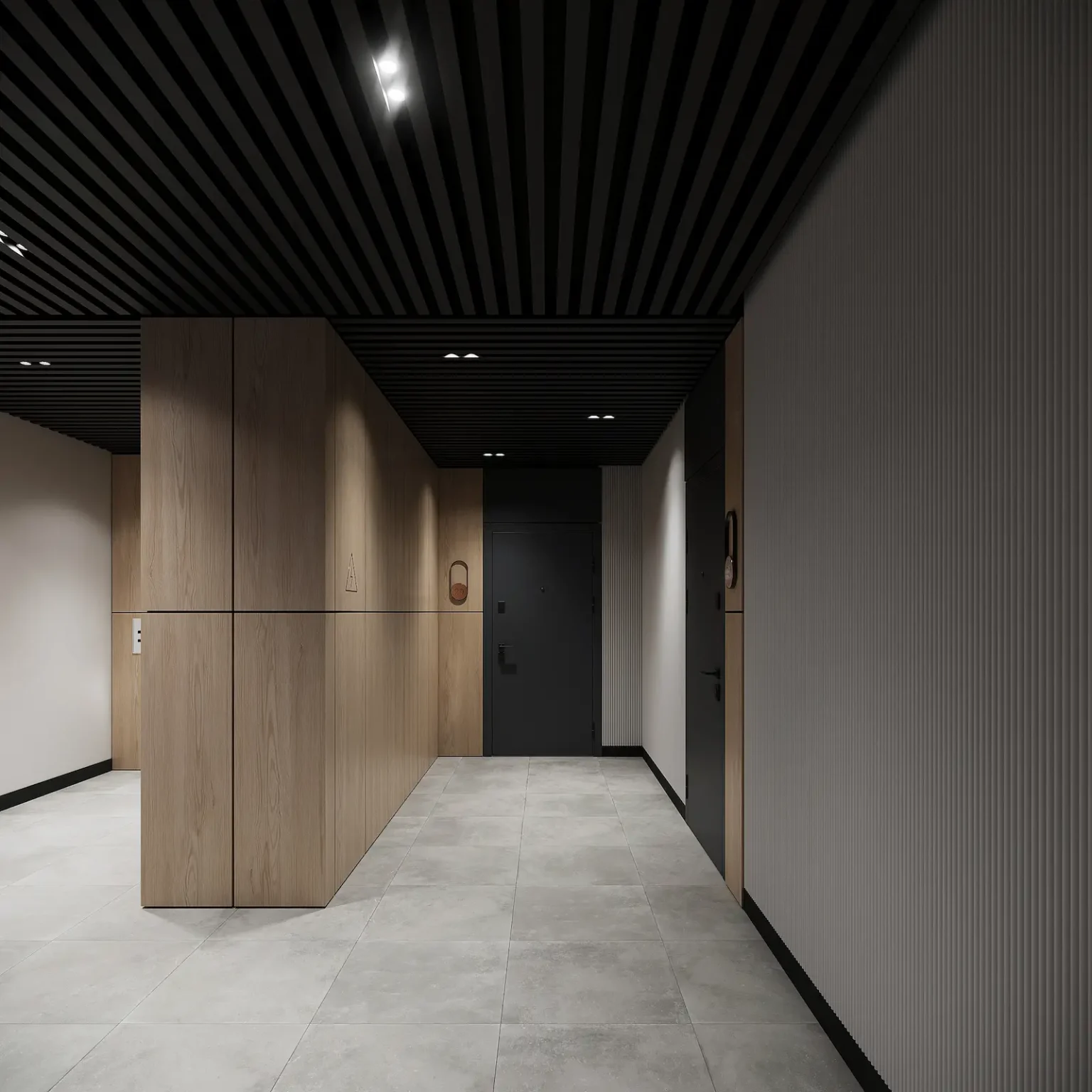 У вхідній зоні розташоване велике дзеркало у повний зріст з фірмовим патерном. Також там розміщена зона з поштовими скриньками, вмонтованими у стіну. Завдяки цьому рішенню ніщо не виступає та не краде ваш простір.