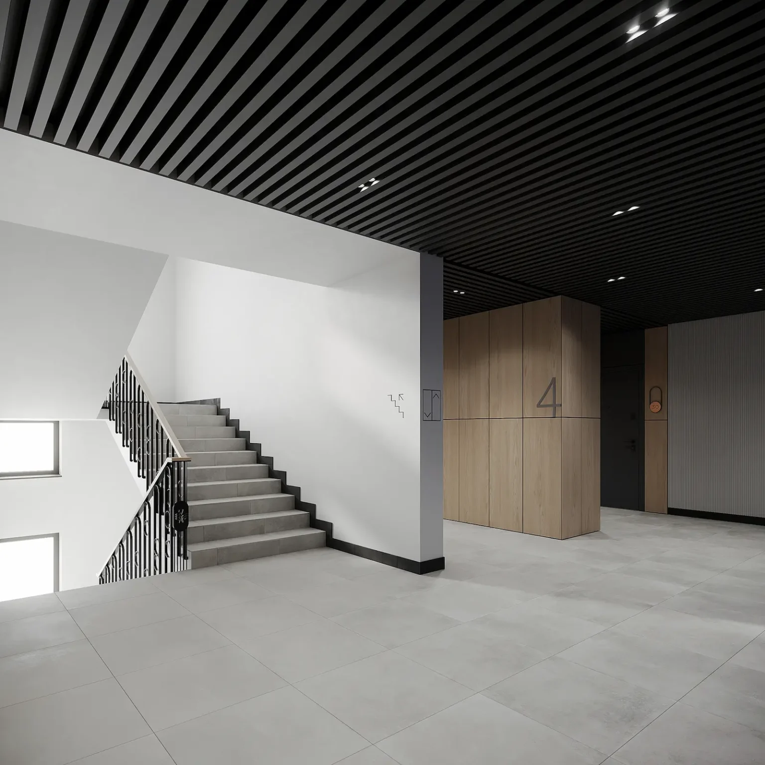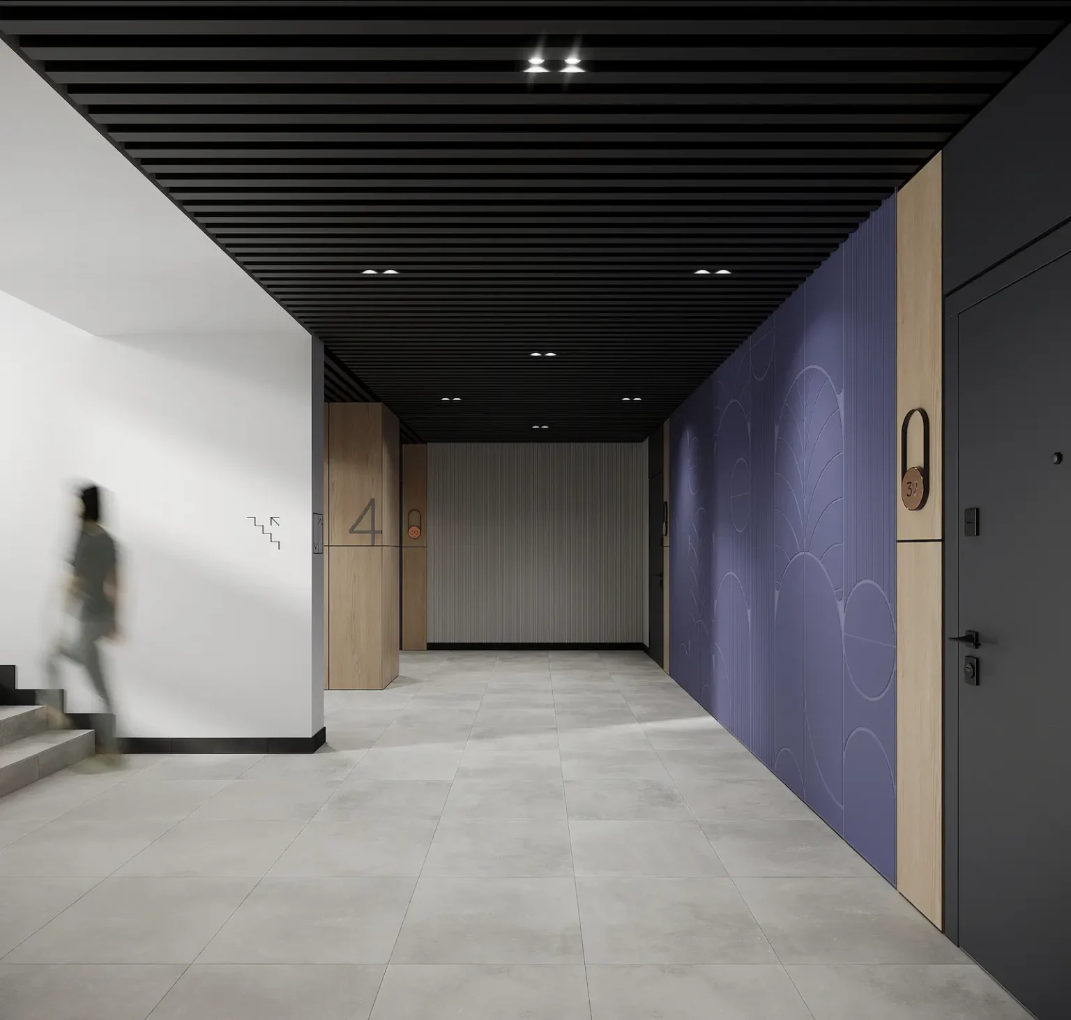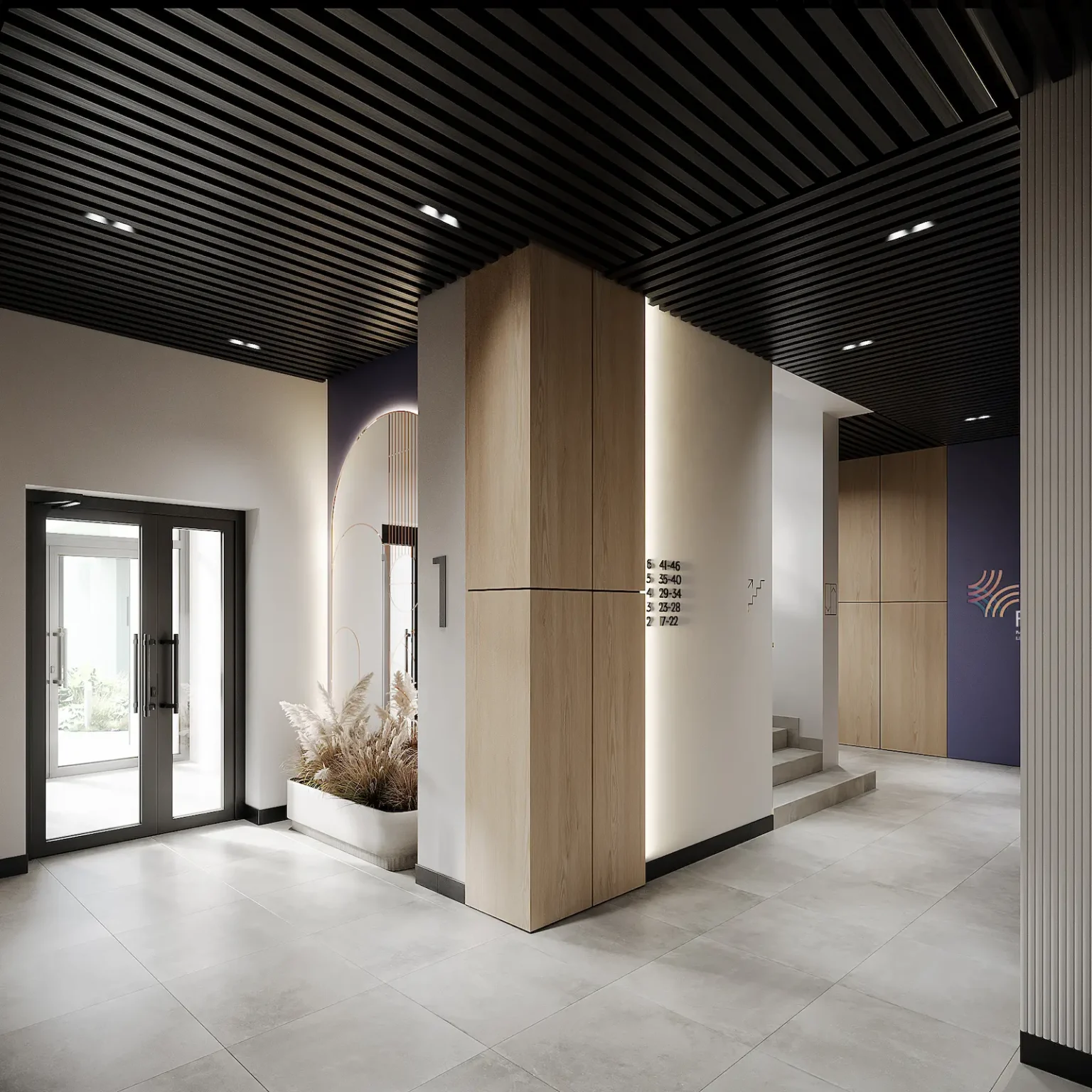 Ось особливості, які ми заклали у дизайн цієї ЗОНИ: Для оздоблення стін використали поєднання білої фарби та ДСП-панелей. Акцентною є стіна у стилі компанії: фіолетовому кольорі з фірмовим патерном. Стеля оздоблена кубоподібними рейками та пофарбована чорною фарбою. Для підлоги обрали світло-сірий керамограніт. Використання таких кольорів закріплює асоціації з ЖК та створює цілісність у дизайні. А гра контрастів є фішкою, яка робить звичайний простір цікавим та стильним. Ми дбаємо не лише про візуальну складову, а й про функціональність. Тож у дизайні можна побачити зручні умовні позначки. Передбачили їх для кожного поверху та номеру квартири.