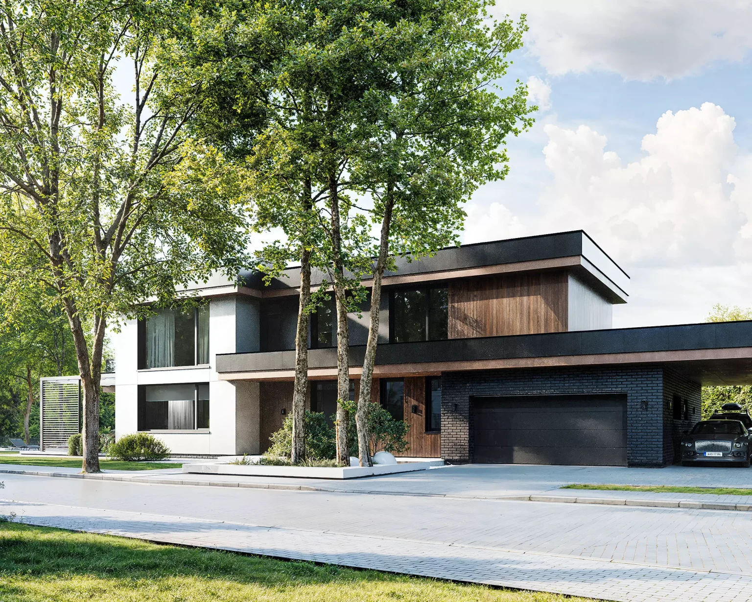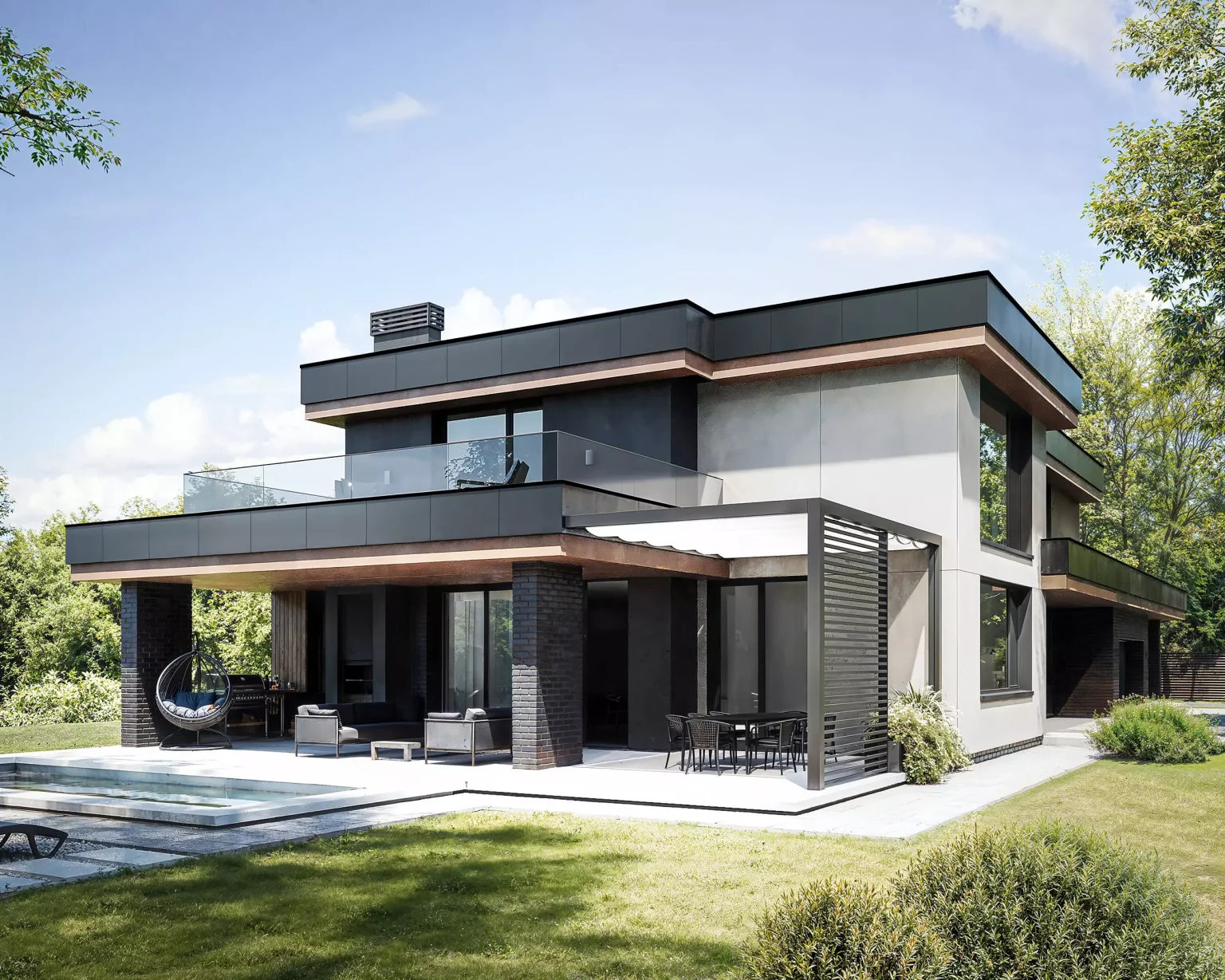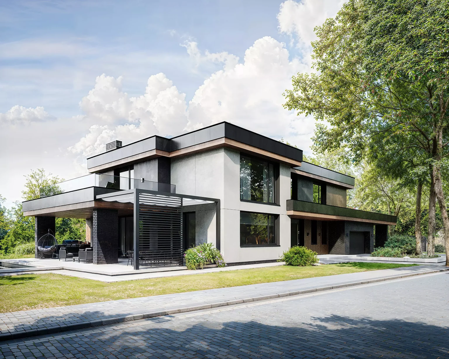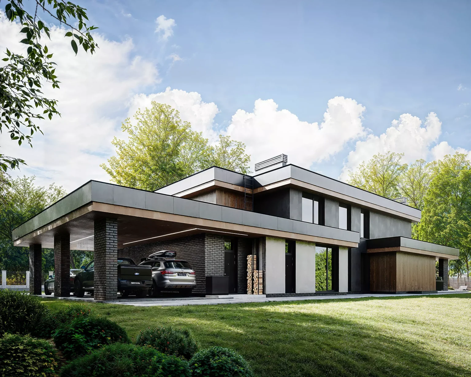 “Horizont Modern” без перебільшень крутий. Двоповерховий будинок з гаражем для двох автомобілів. Сучасний стиль, плоский дах, чіткі лінії. У зовнішньому опорядженні використано декоративну штукатурку, фасадні дошки планкен, а також вентильований фасад.