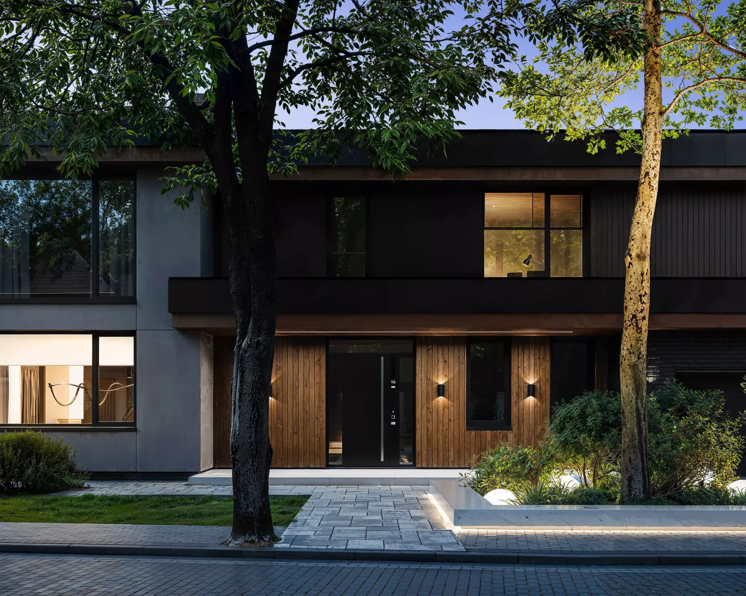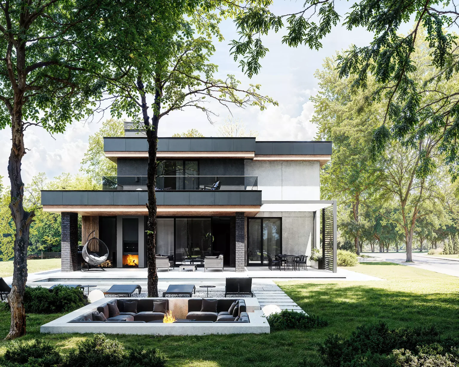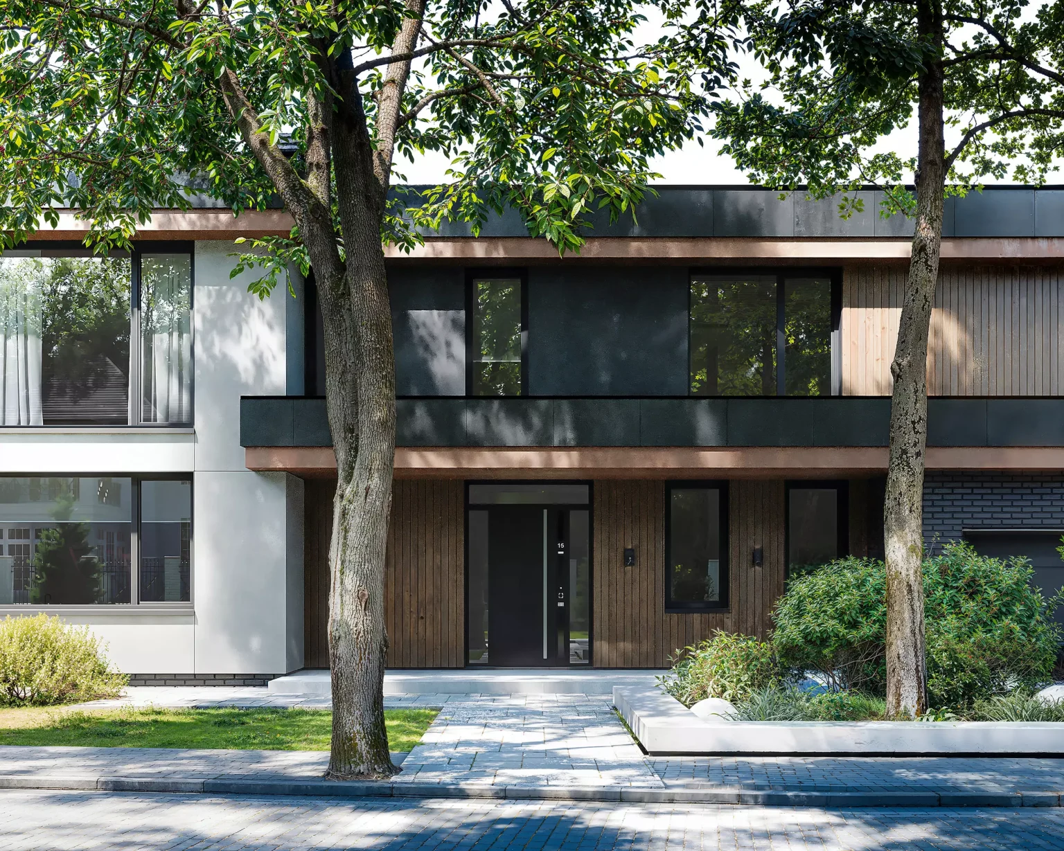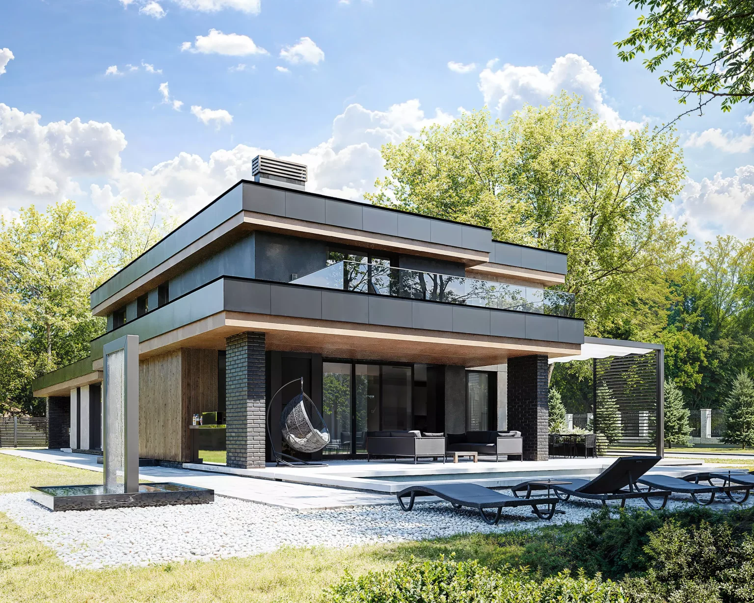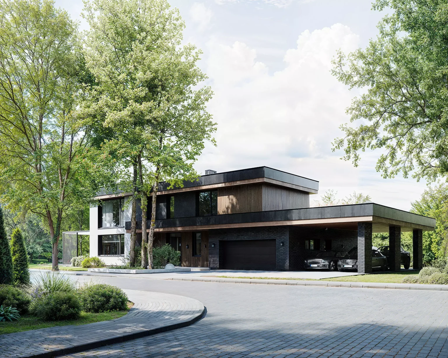 “Horizont Modern” без перебільшень крутий. Двоповерховий будинок з гаражем для двох автомобілів. Сучасний стиль, плоский дах, чіткі лінії. У зовнішньому опорядженні використано декоративну штукатурку, фасадні дошки планкен, а також вентильований фасад.