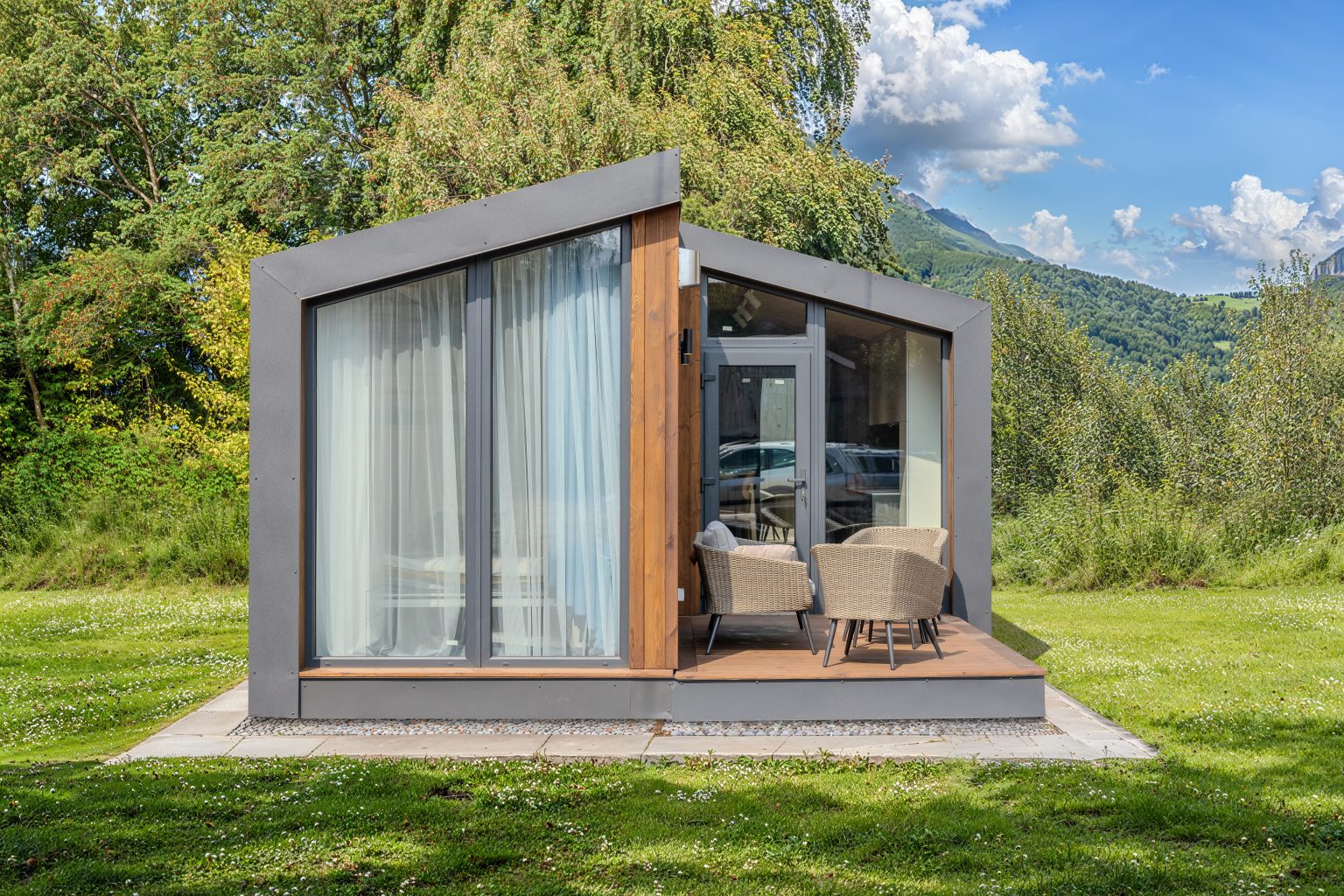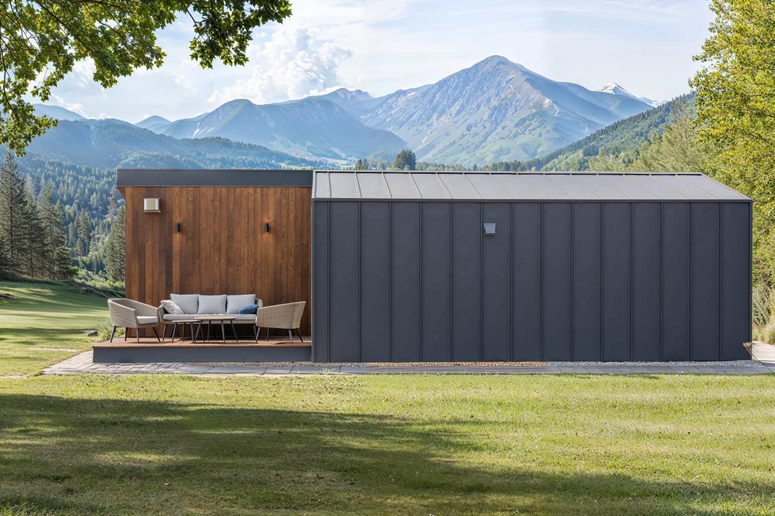 виглядатиме стильно й вишукано. Будинок складається з двох модулів, які транспортуються на ділянку окремо. Це забезпечує легкість перевезення та прискорює процес встановлення на місці. Матеріали будинку передовсім практичні. Щоб зробити його легким та міцним, ми обрали конструкцію з лстк та заповнили її пінооліуретаном.