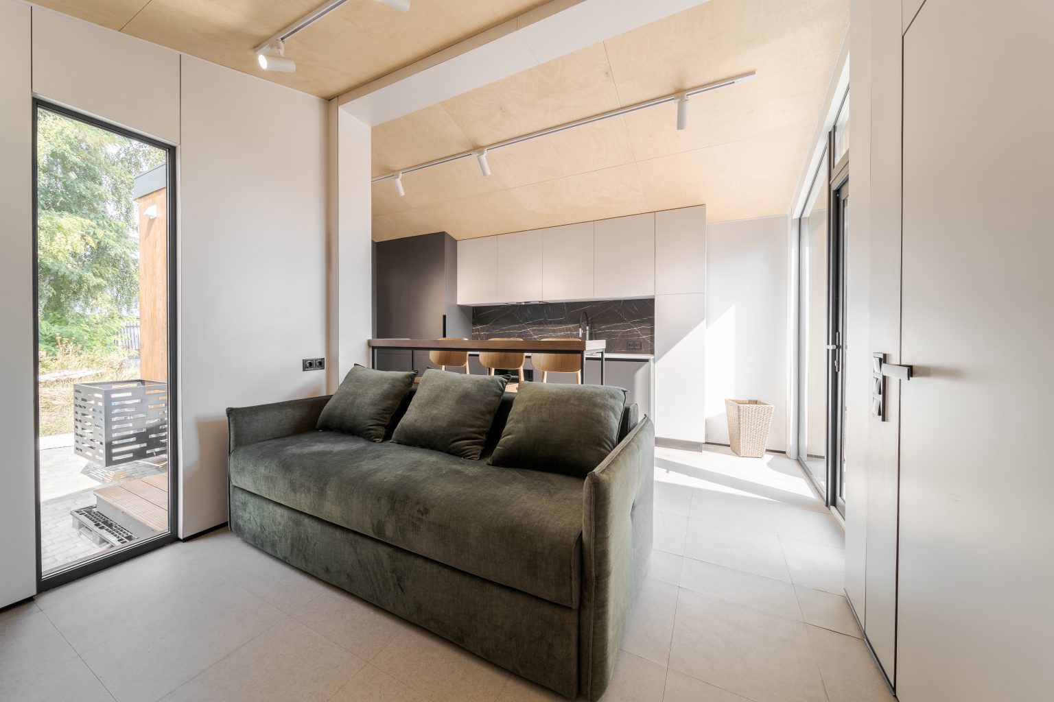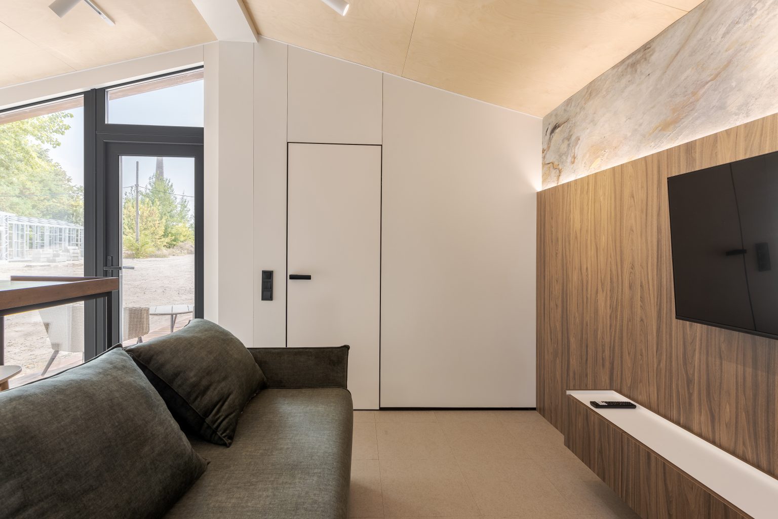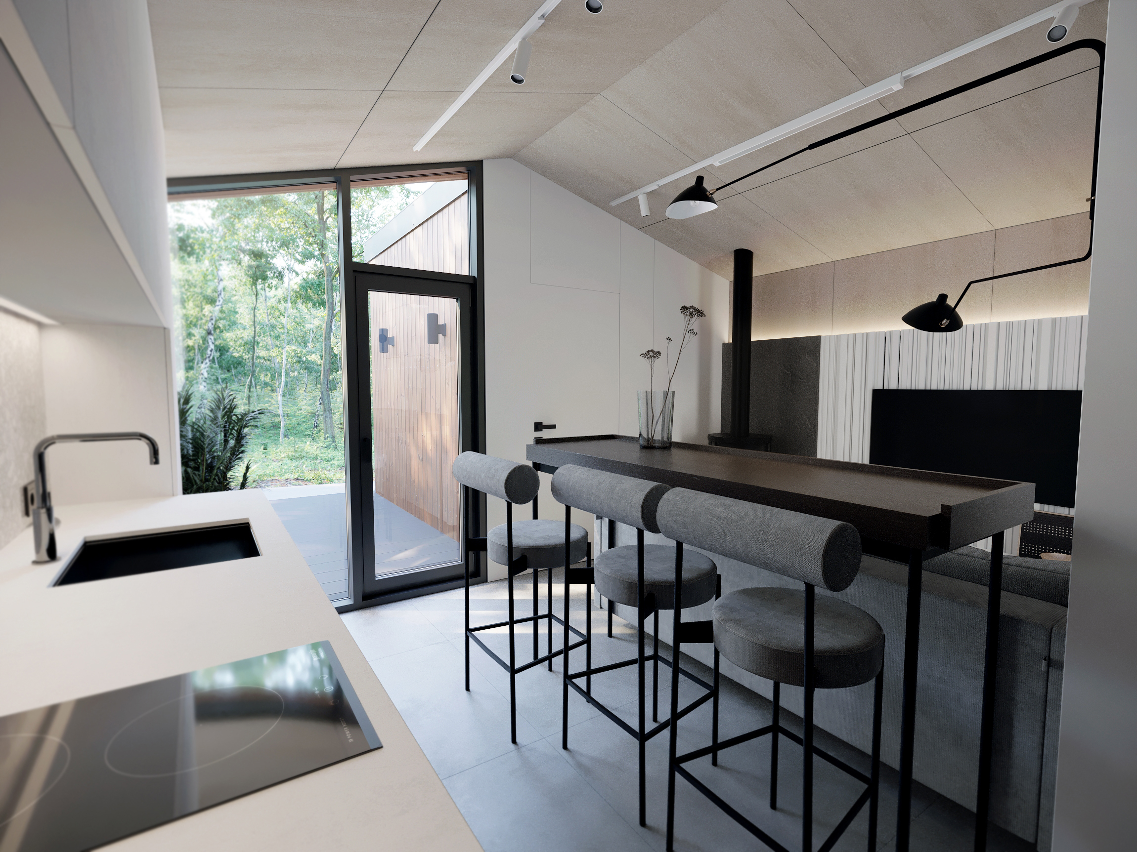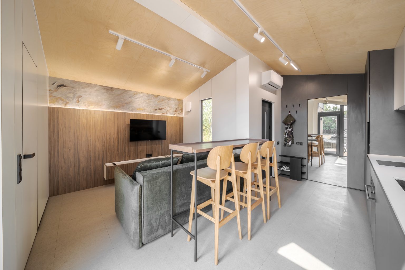 Кухня-вітальня в Lomanini house. Все оздоблення ми виконали з фанери. Окремі місця обшиті HPL пластиком та камʼяним шпоном. Для кліматизації ми передбачили електричні радіатори та кондиціонер та рекуператори для рівномірного потоку повітря. Для освітлення обрали точкові світильники Kloodi. Кухонна зона — функціональна. У гарнітур ми вмонтували усю необхідну побутову техніку, включно з бойлером. Стільниця виконана з HPL пластику. Барна стійка розділяє зони кухні й вітальні й обладнана трьома стільцями. Одразу за стійкою розташований комфортний розкладний диван, який може слугувати додатковим спальним місцем. Навпроти ми облаштували стінову панель з камʼяним шпоном, контурною підсвіткою та телевізором. Також у цій зоні є можливість встановлення камінної топки.