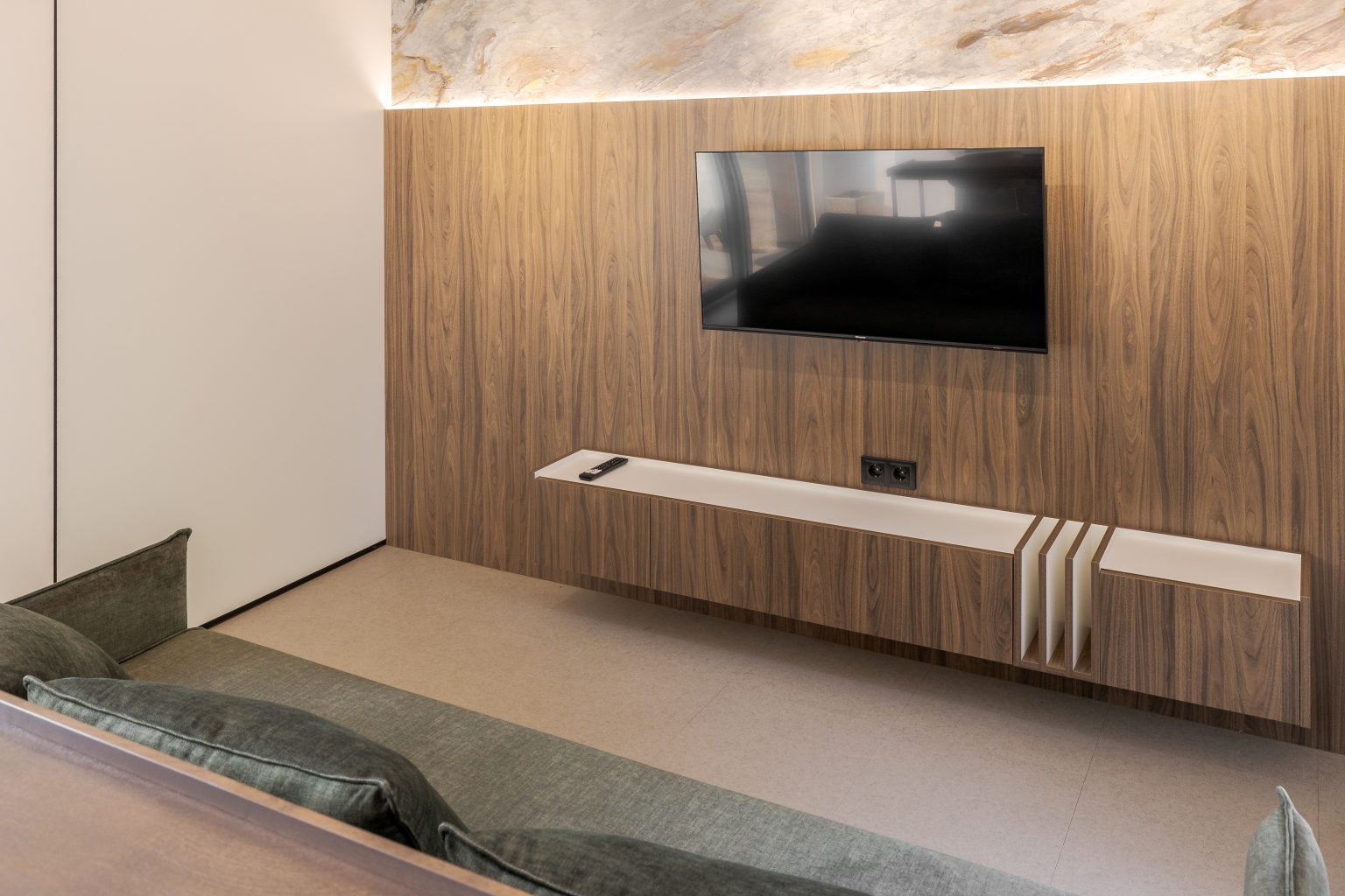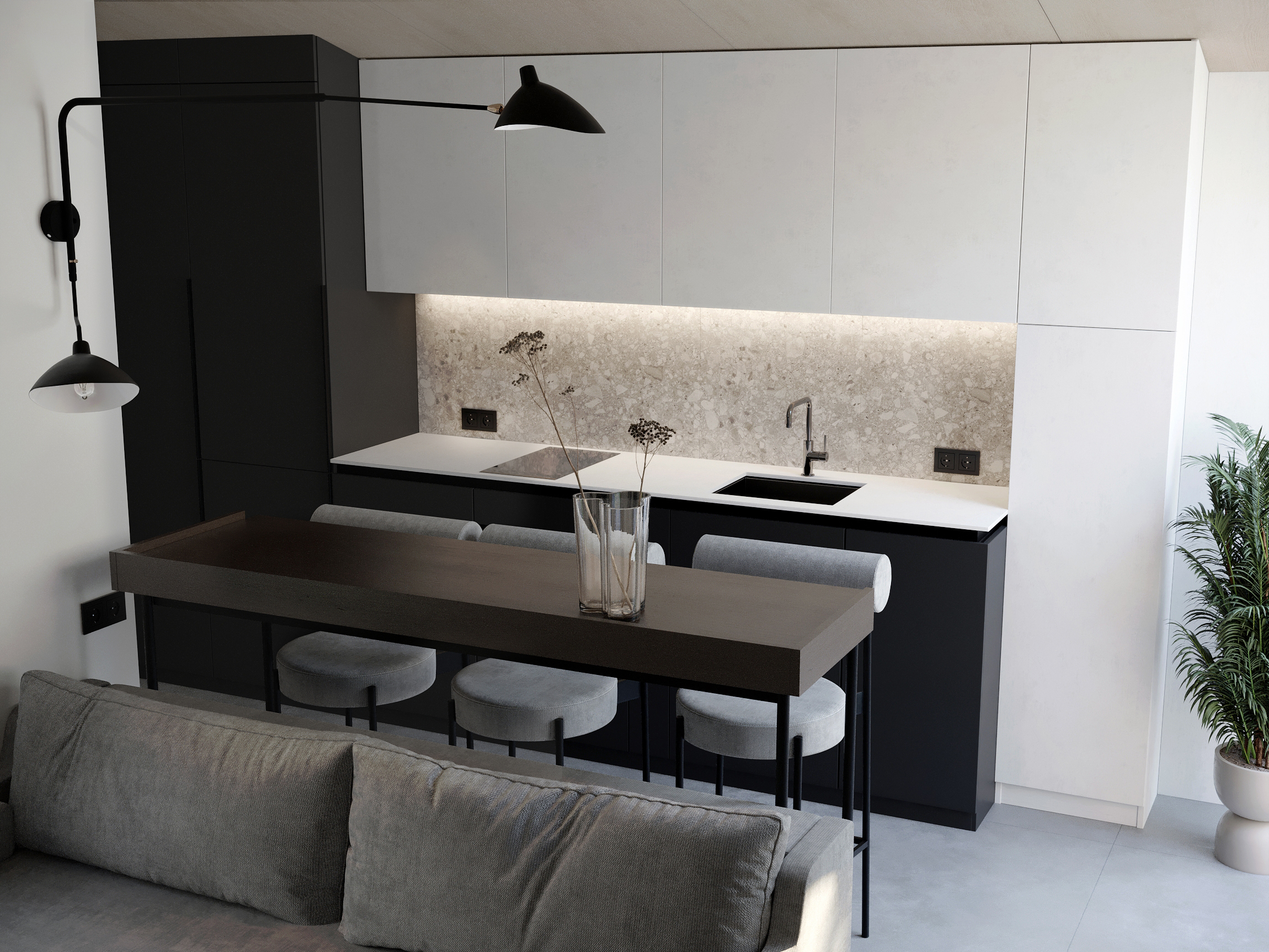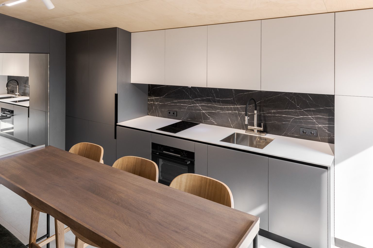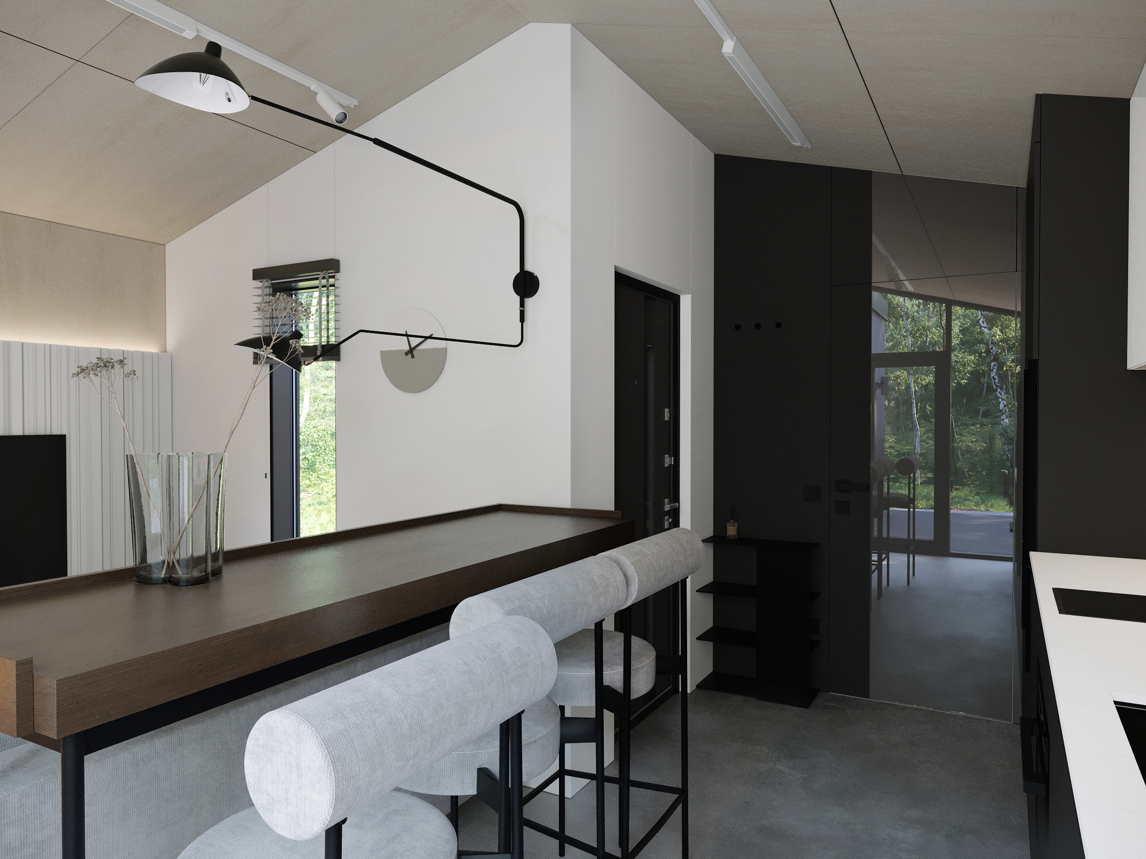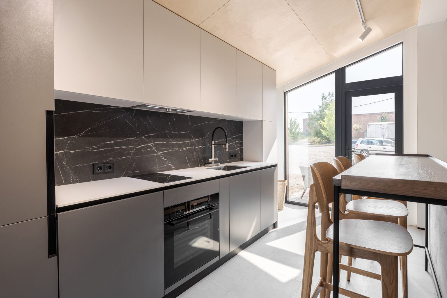 Кухня-вітальня в Lomanini house. Все оздоблення ми виконали з фанери. Окремі місця обшиті HPL пластиком та камʼяним шпоном. Для кліматизації ми передбачили електричні радіатори та кондиціонер та рекуператори для рівномірного потоку повітря. Для освітлення обрали точкові світильники Kloodi. Кухонна зона — функціональна. У гарнітур ми вмонтували усю необхідну побутову техніку, включно з бойлером. Стільниця виконана з HPL пластику. Барна стійка розділяє зони кухні й вітальні й обладнана трьома стільцями. Одразу за стійкою розташований комфортний розкладний диван, який може слугувати додатковим спальним місцем. Навпроти ми облаштували стінову панель з камʼяним шпоном, контурною підсвіткою та телевізором. Також у цій зоні є можливість встановлення камінної топки.