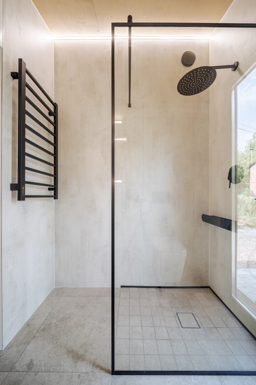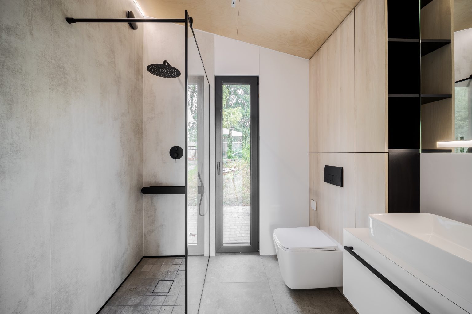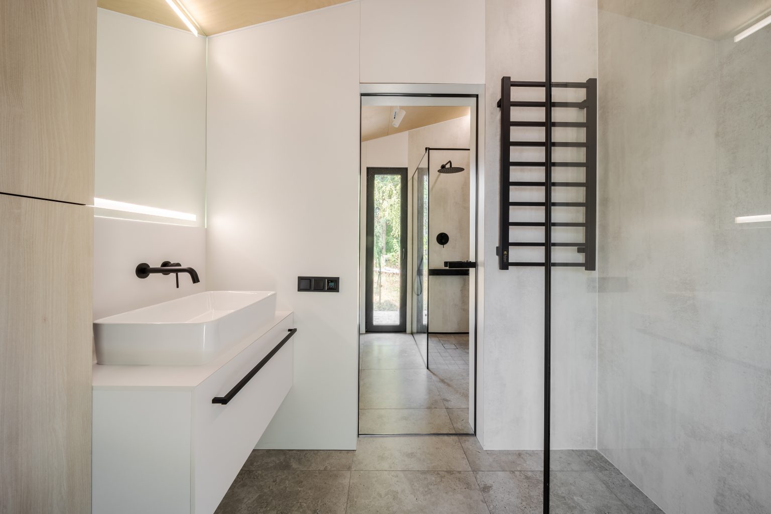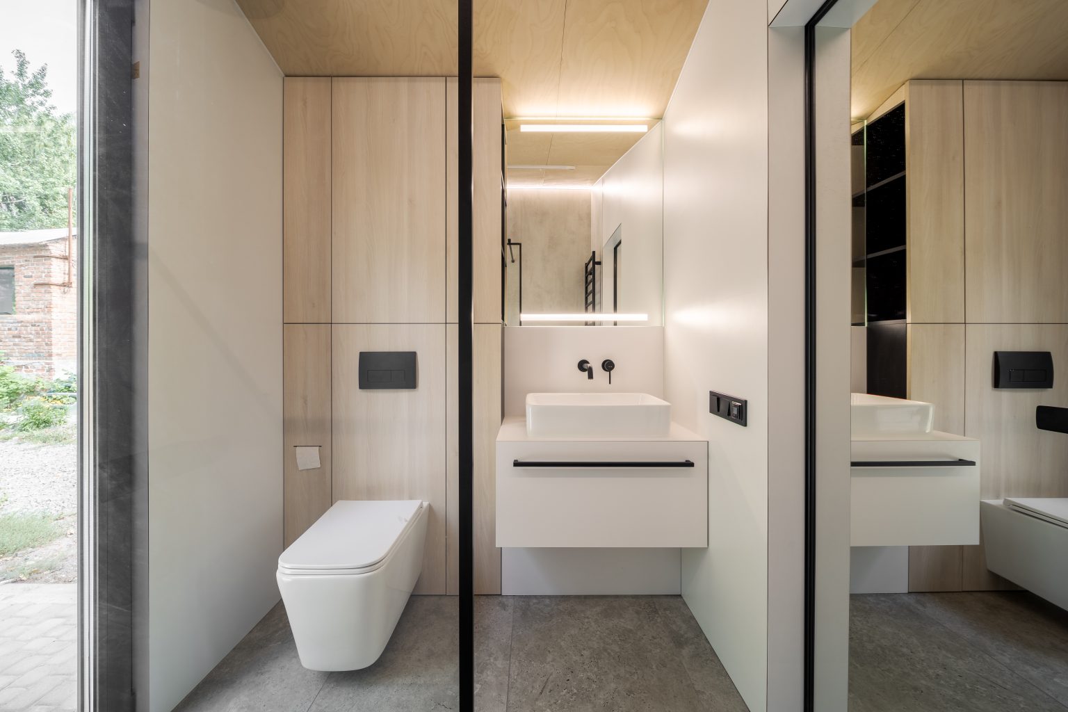 Санвузол Lomanini house виконаний у світлій колірній палітрі. Для оздоблення поверхонь обрали легкі матеріали: пластик, фанеру й керамограніт для підлоги.