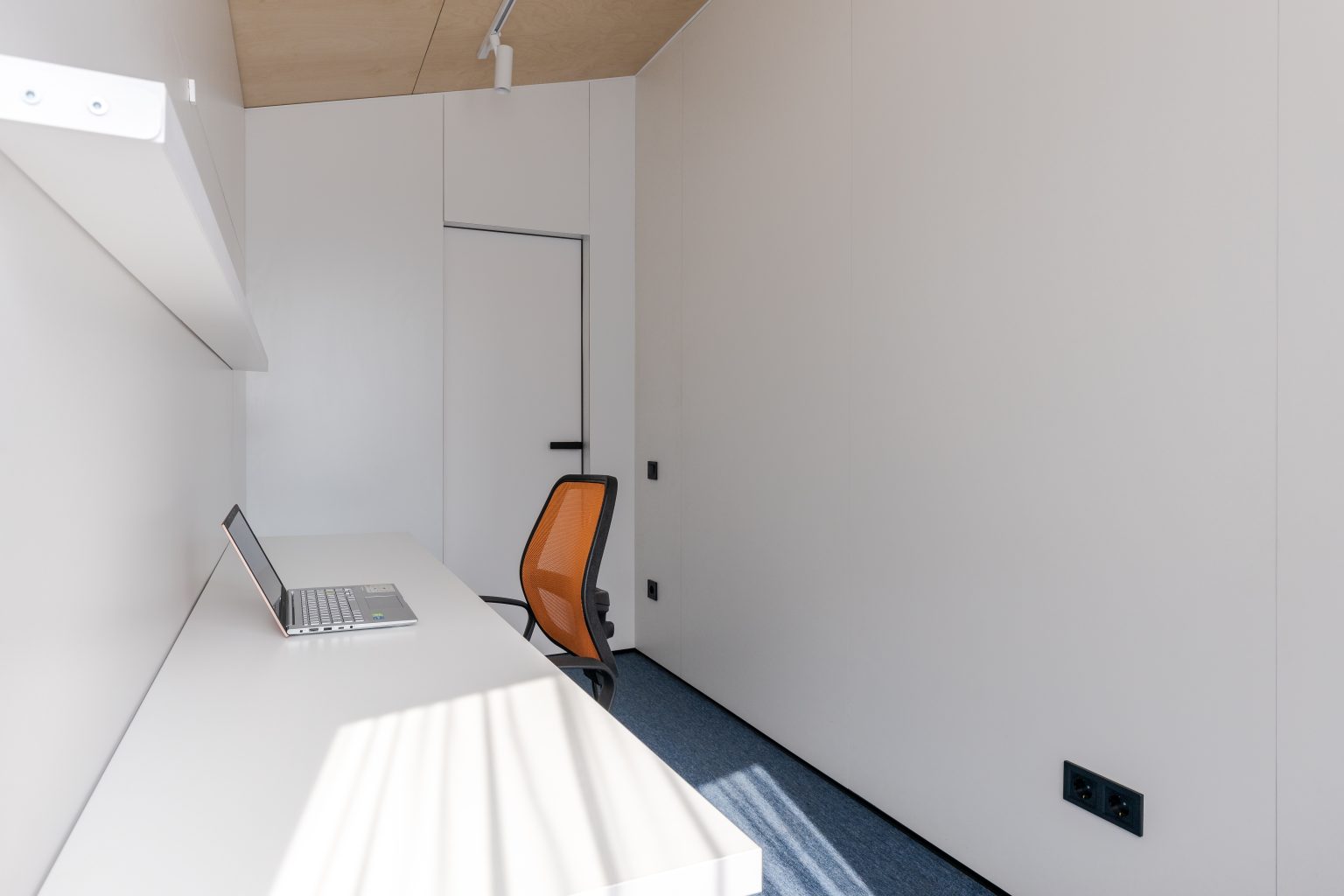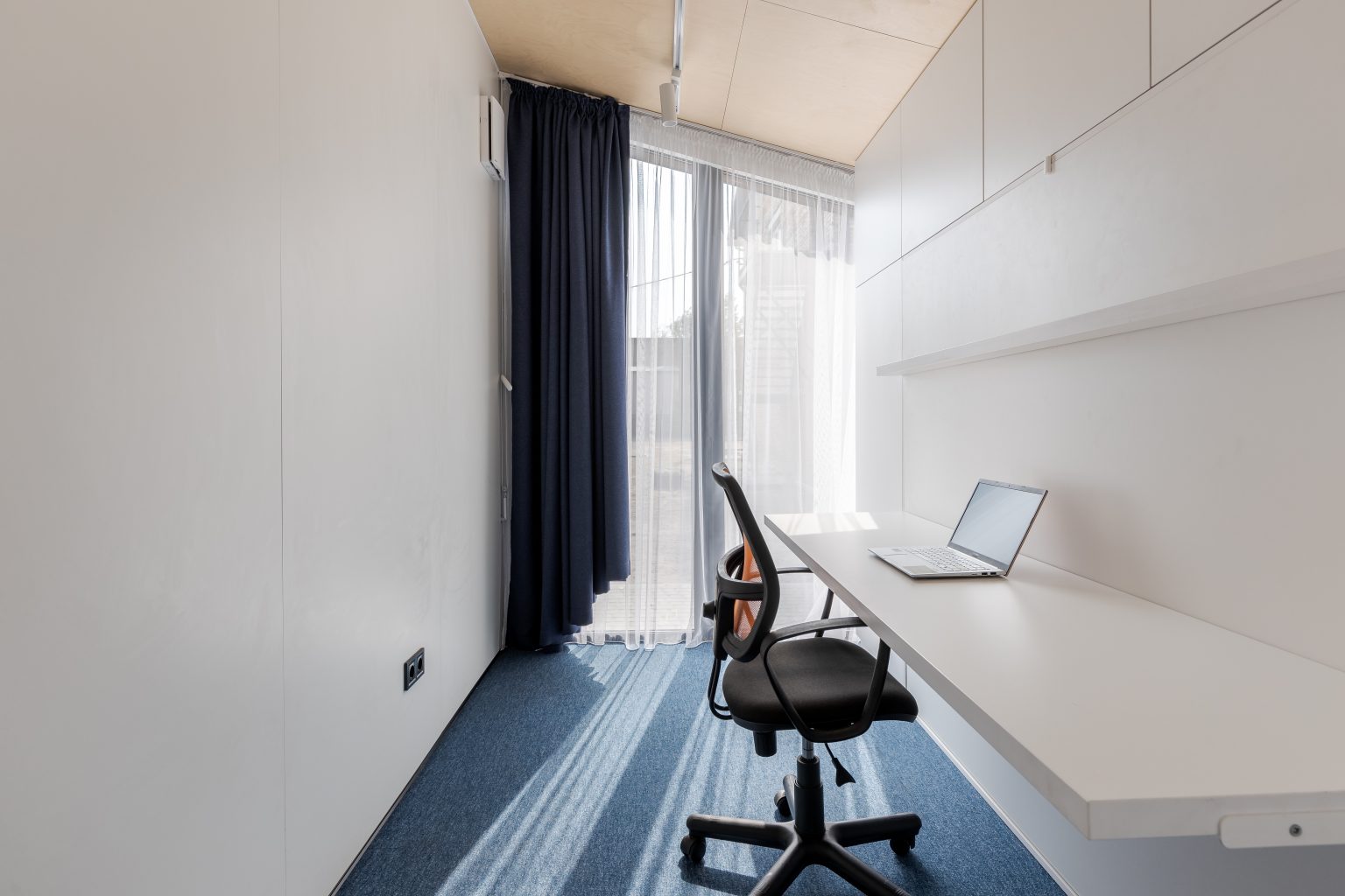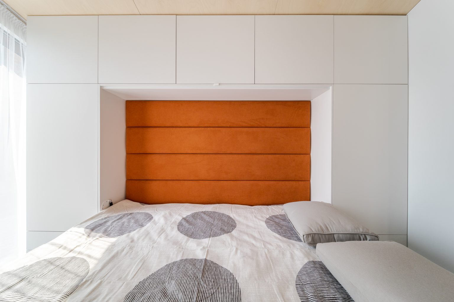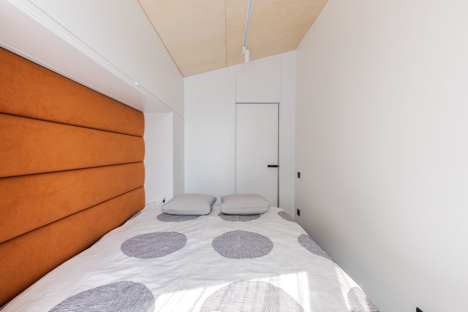 Грамотне планування, і навіть невелика площа може бути комфортною, затишною і функціональною. Спальня Lomanini house вийшла саме такою. У ролі шафи виступає меблевий гарнітур на всю площу стіни, туди ж вмонтували ліжко-трансформер. У складеному вигляді воно перетворюється робочий стіл, а в розкладеному - на двоспальне місце для сну. Всередині передбачені розетки, мʼяка оббивка та контурна підсвітка. Таке рішення допомогло зекономити площу та облаштувати одразу дві зони: для відпочинку й роботи. Стіни білого кольору обшиті фанерою та пластиком. Також у спальні є панорамне вікно на всю стіну, що дає можливість спостерігати неймовірні краєвиди.