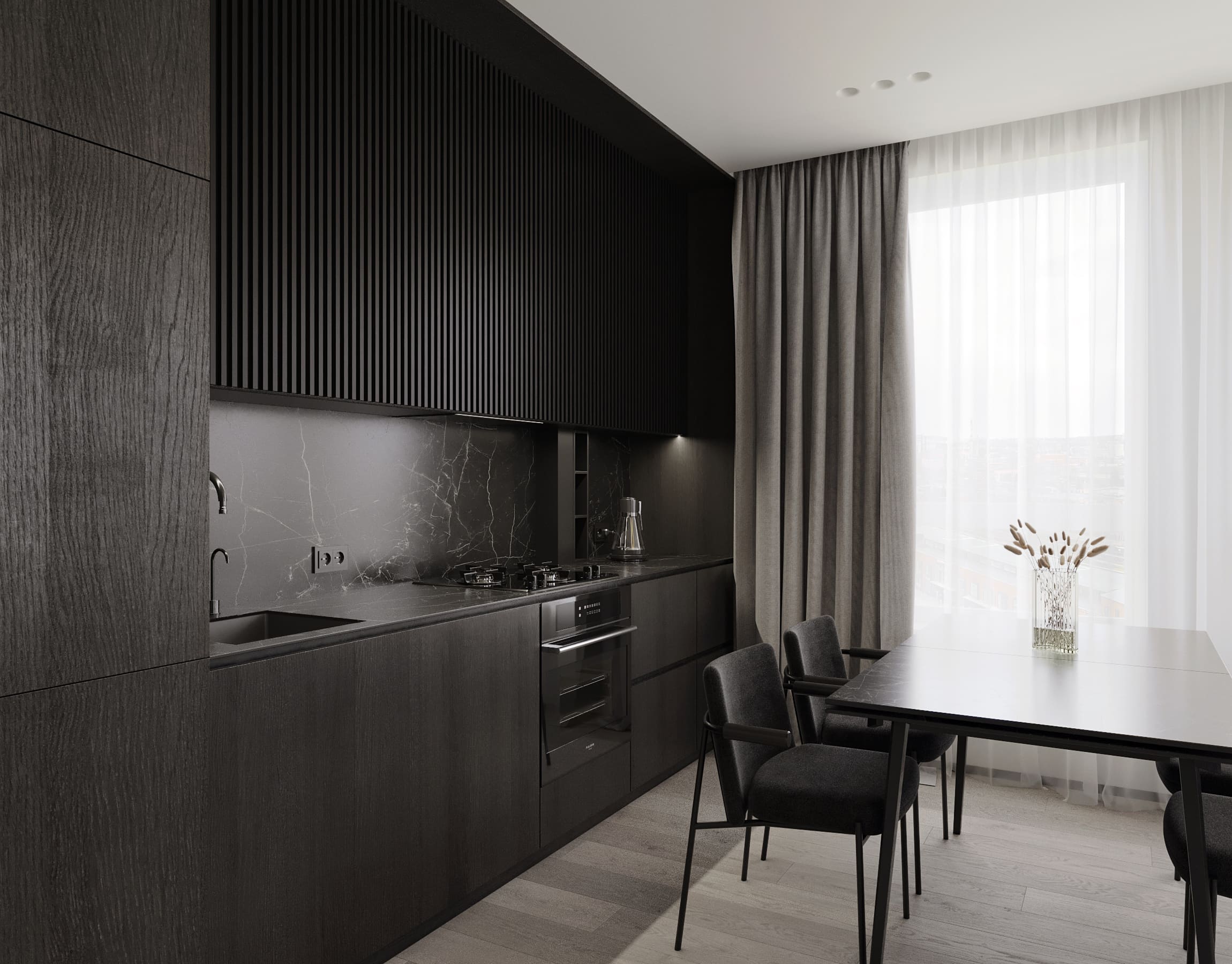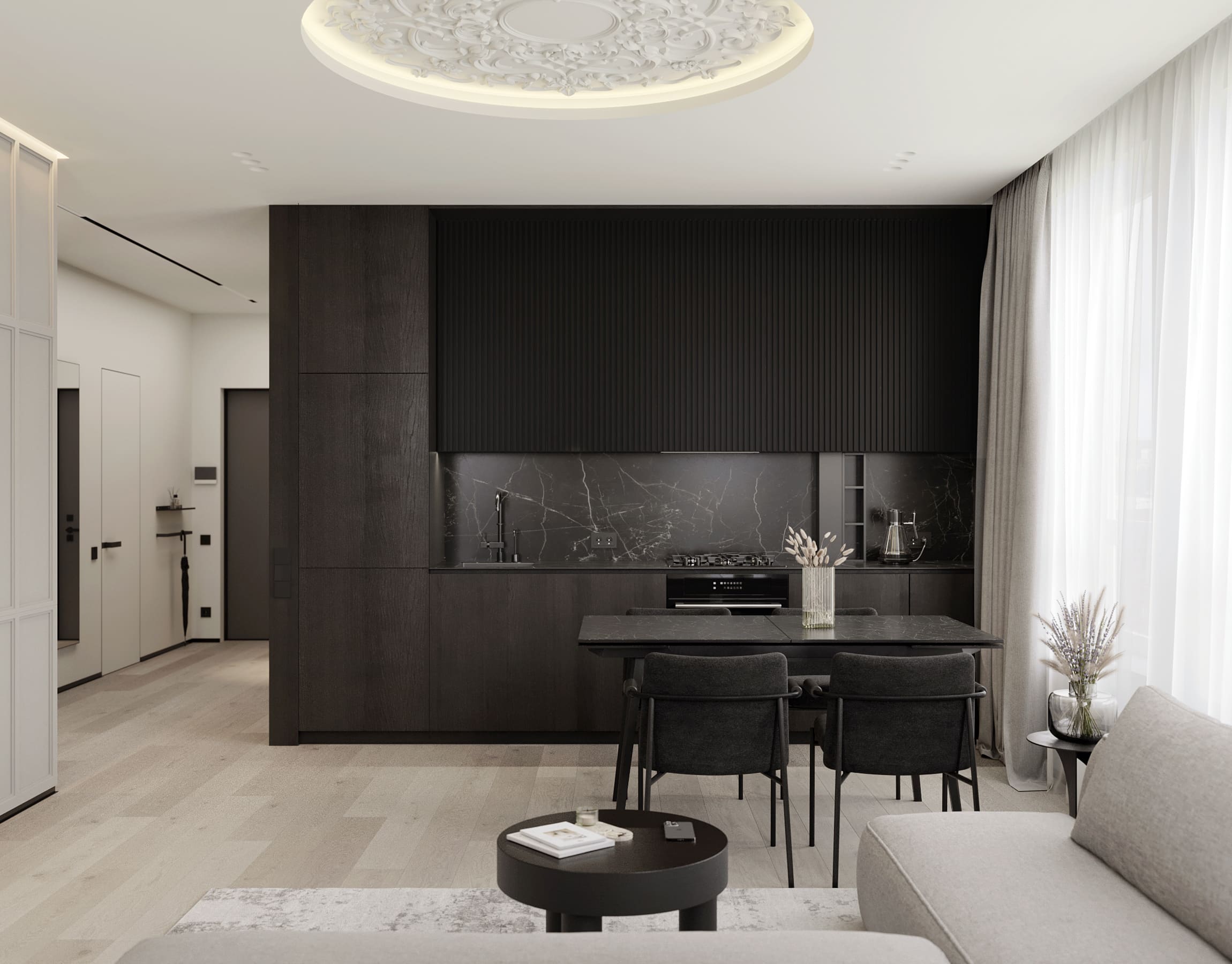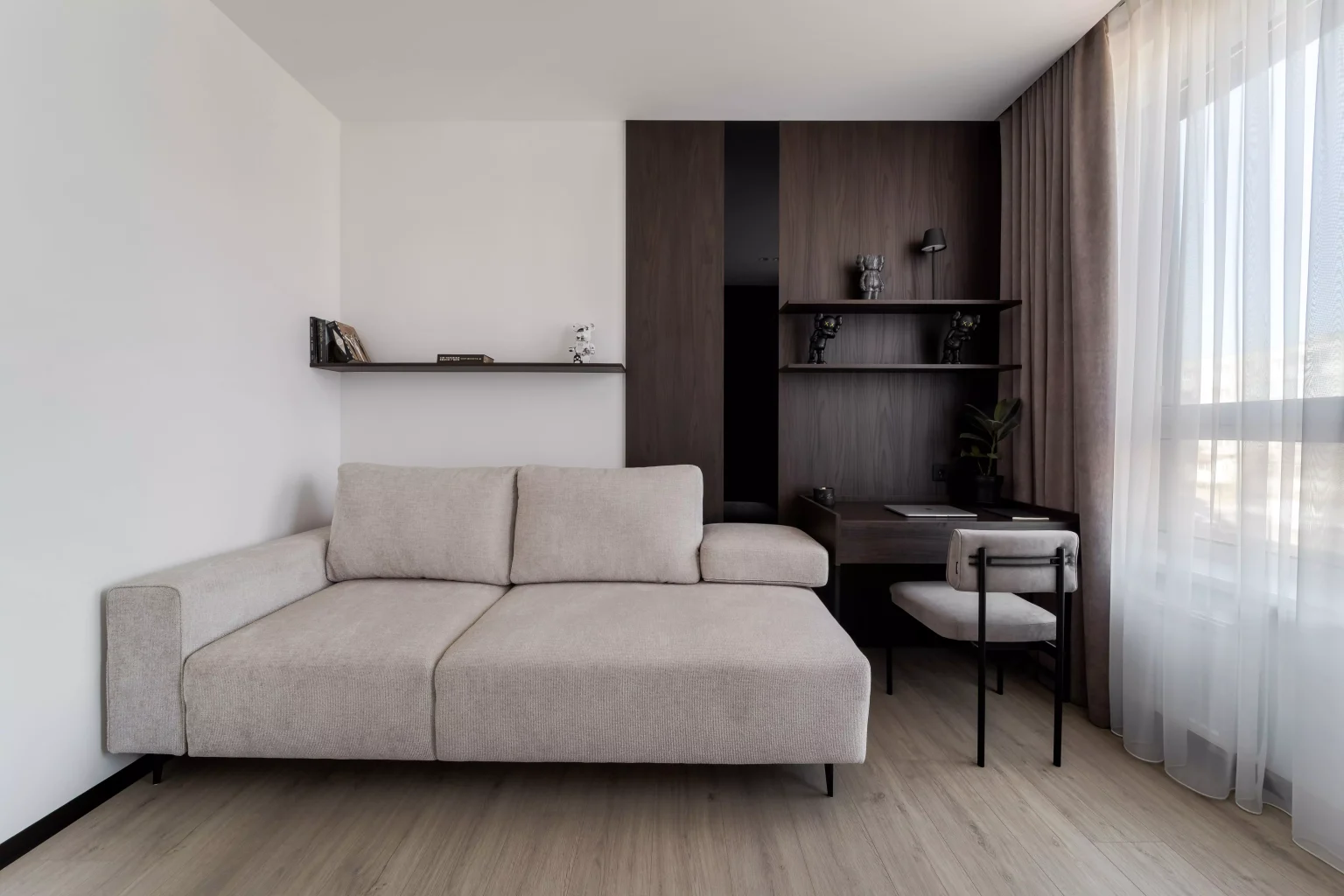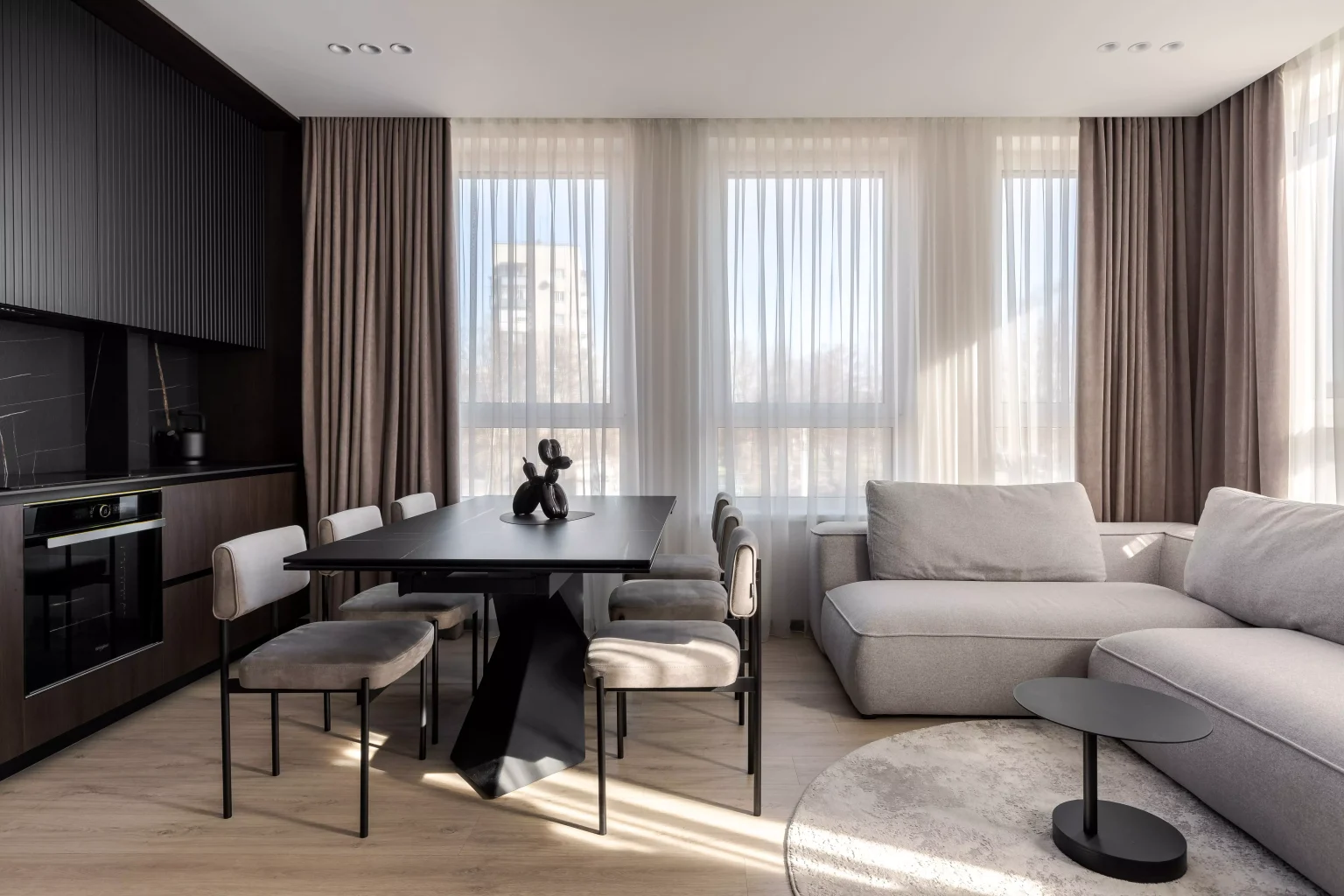 Ця квартира — втілення спокою та вишуканого мінімалізму. Простір, де архітектура поєднується з емоцією, а кожен елемент інтер’єру говорить мовою стилю та балансу. Натуральне світло м’яко проникає крізь напівпрозорі штори, огортаючи інтер’єр теплими відтінками каменю, графіту та піску.