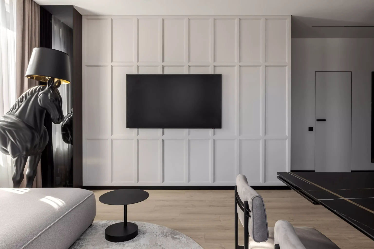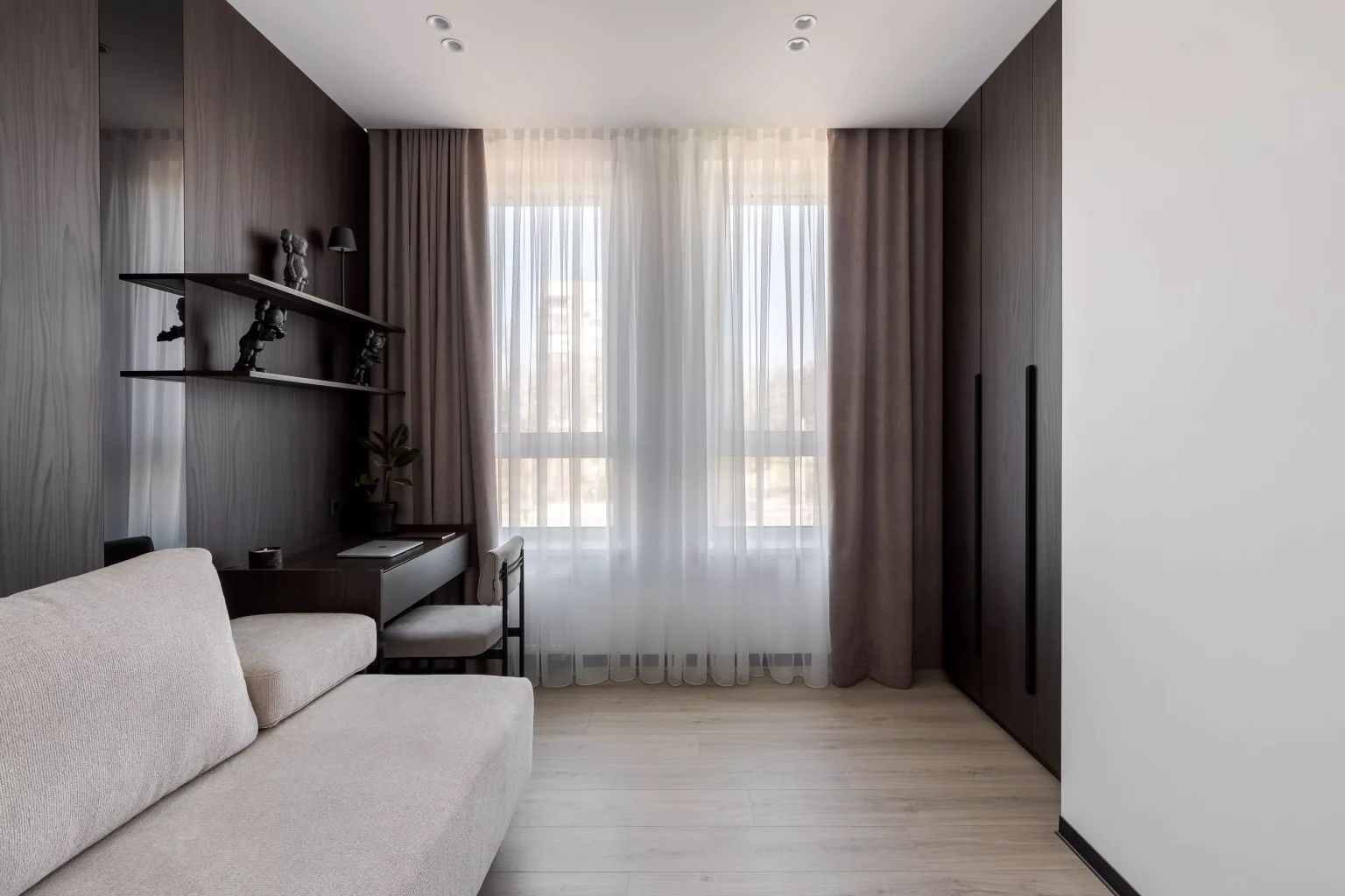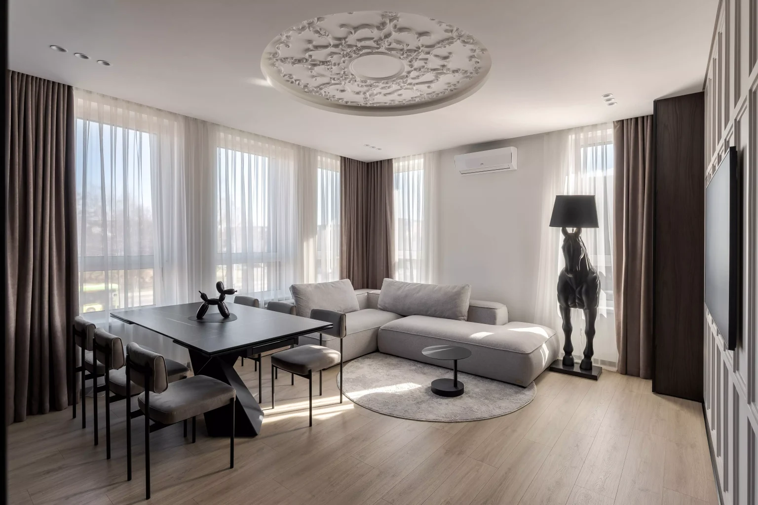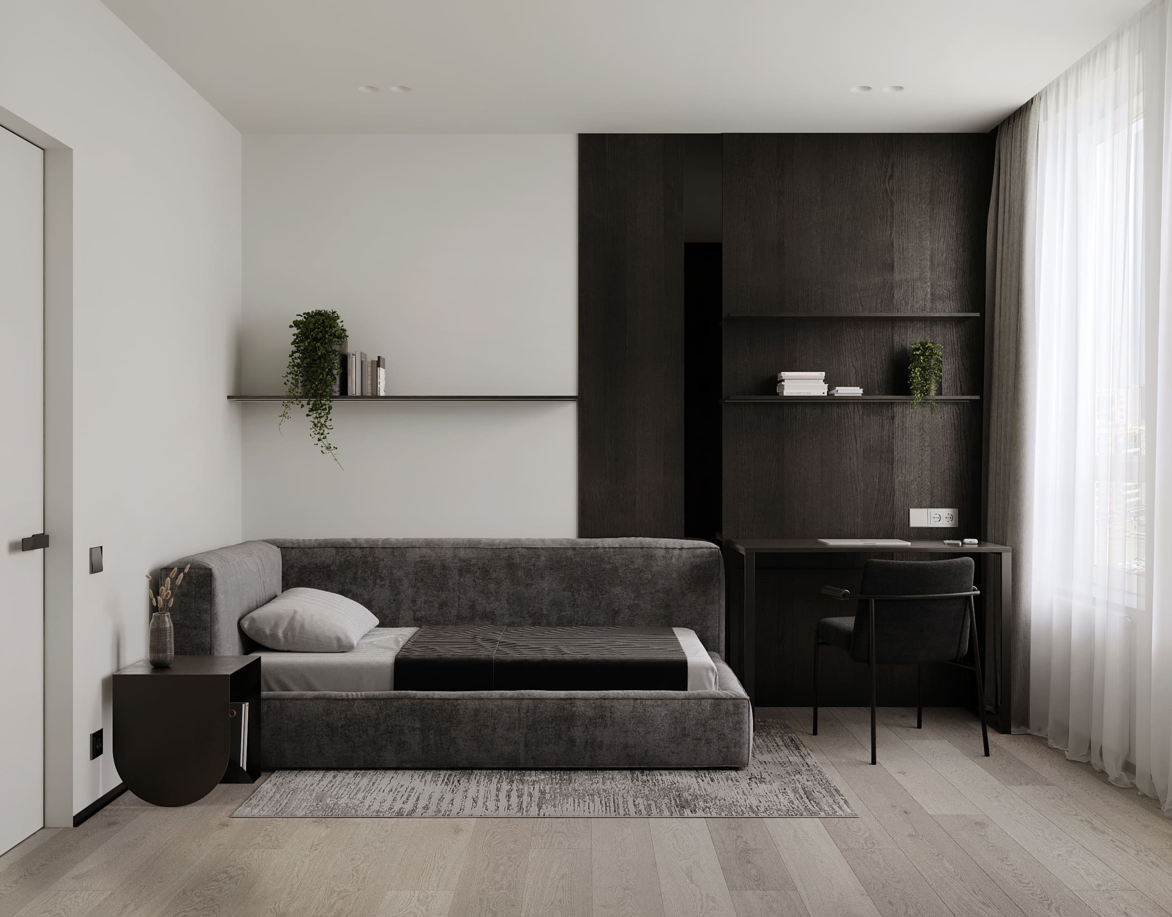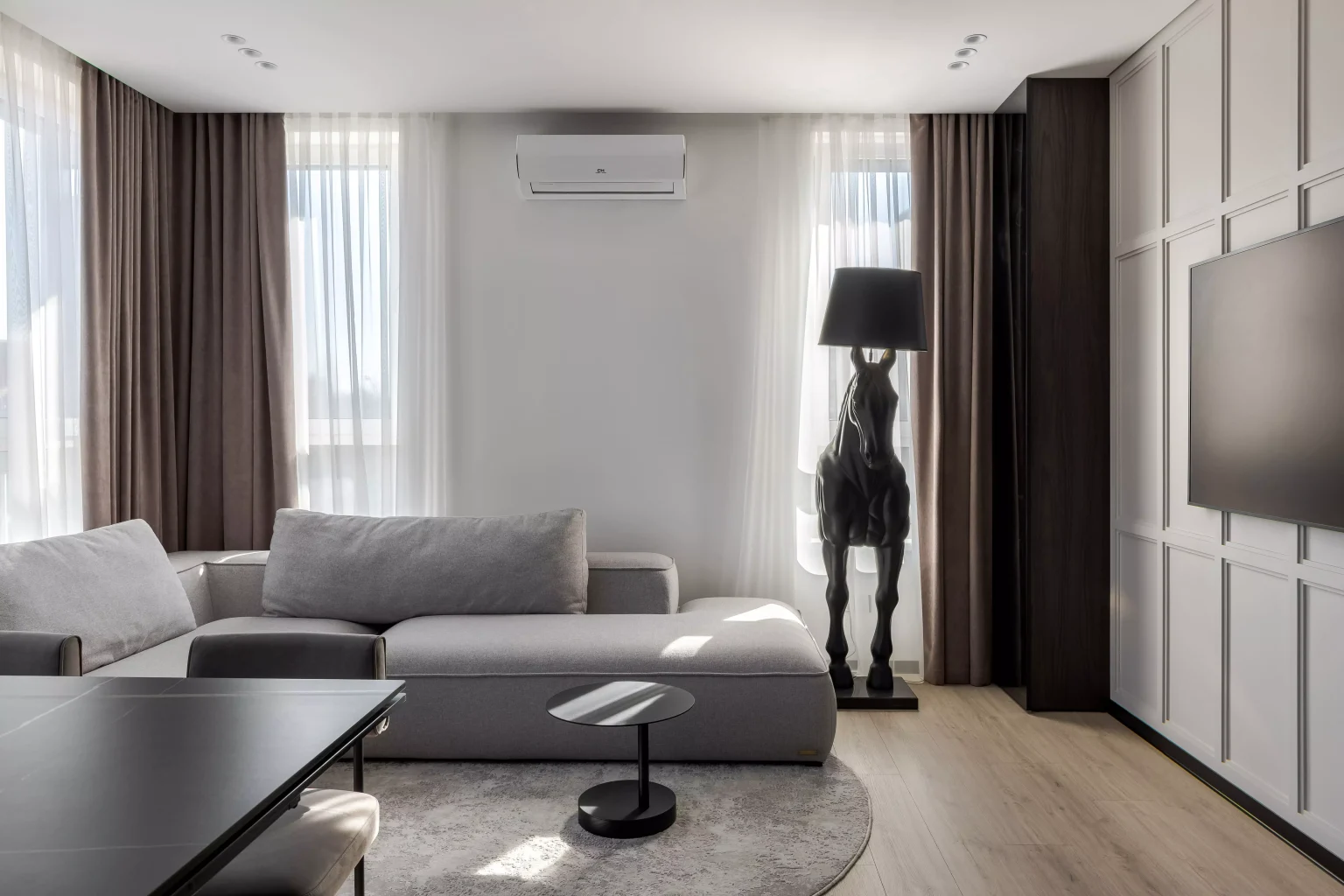 Ця квартира — втілення спокою та вишуканого мінімалізму. Простір, де архітектура поєднується з емоцією, а кожен елемент інтер’єру говорить мовою стилю та балансу. Натуральне світло м’яко проникає крізь напівпрозорі штори, огортаючи інтер’єр теплими відтінками каменю, графіту та піску.