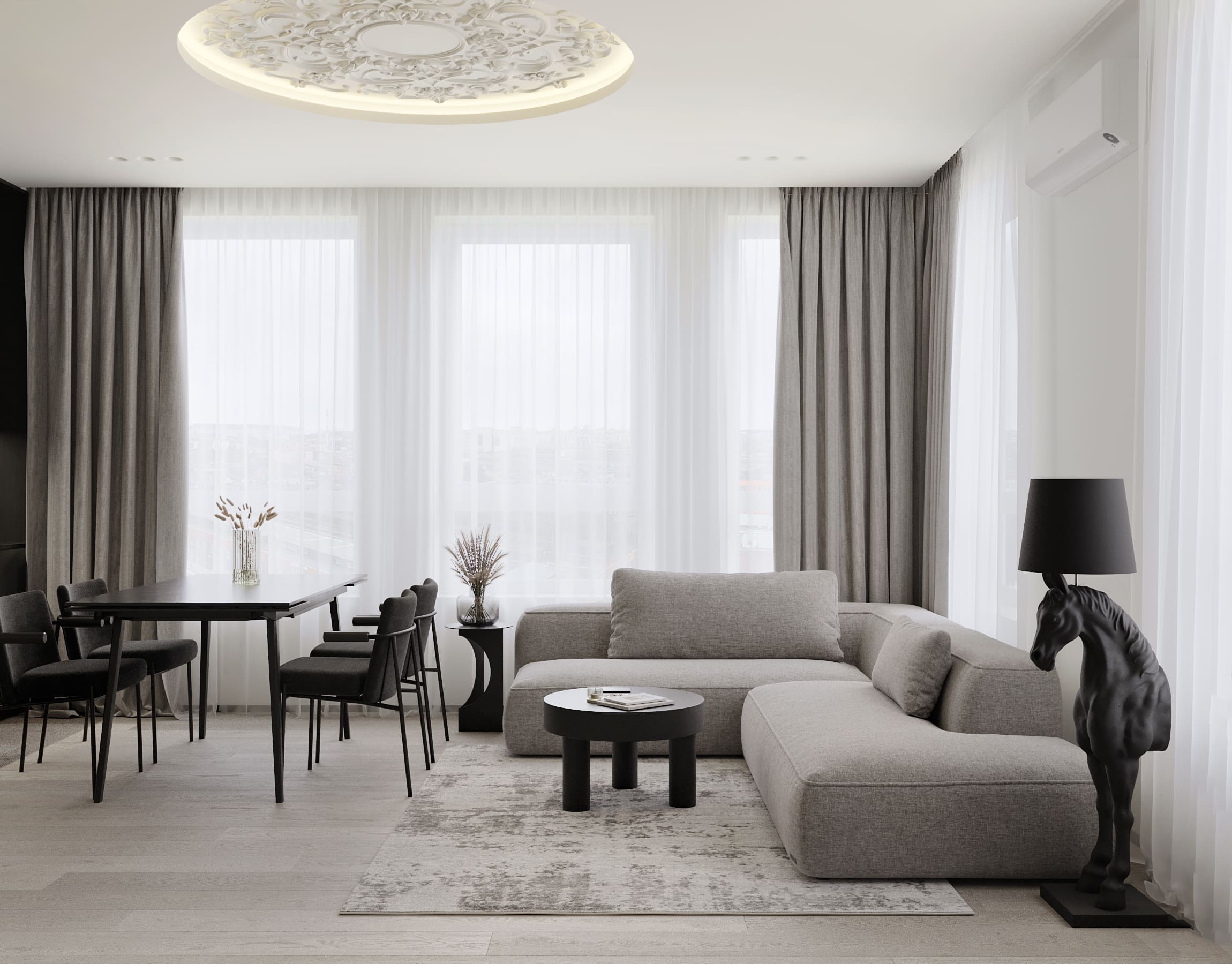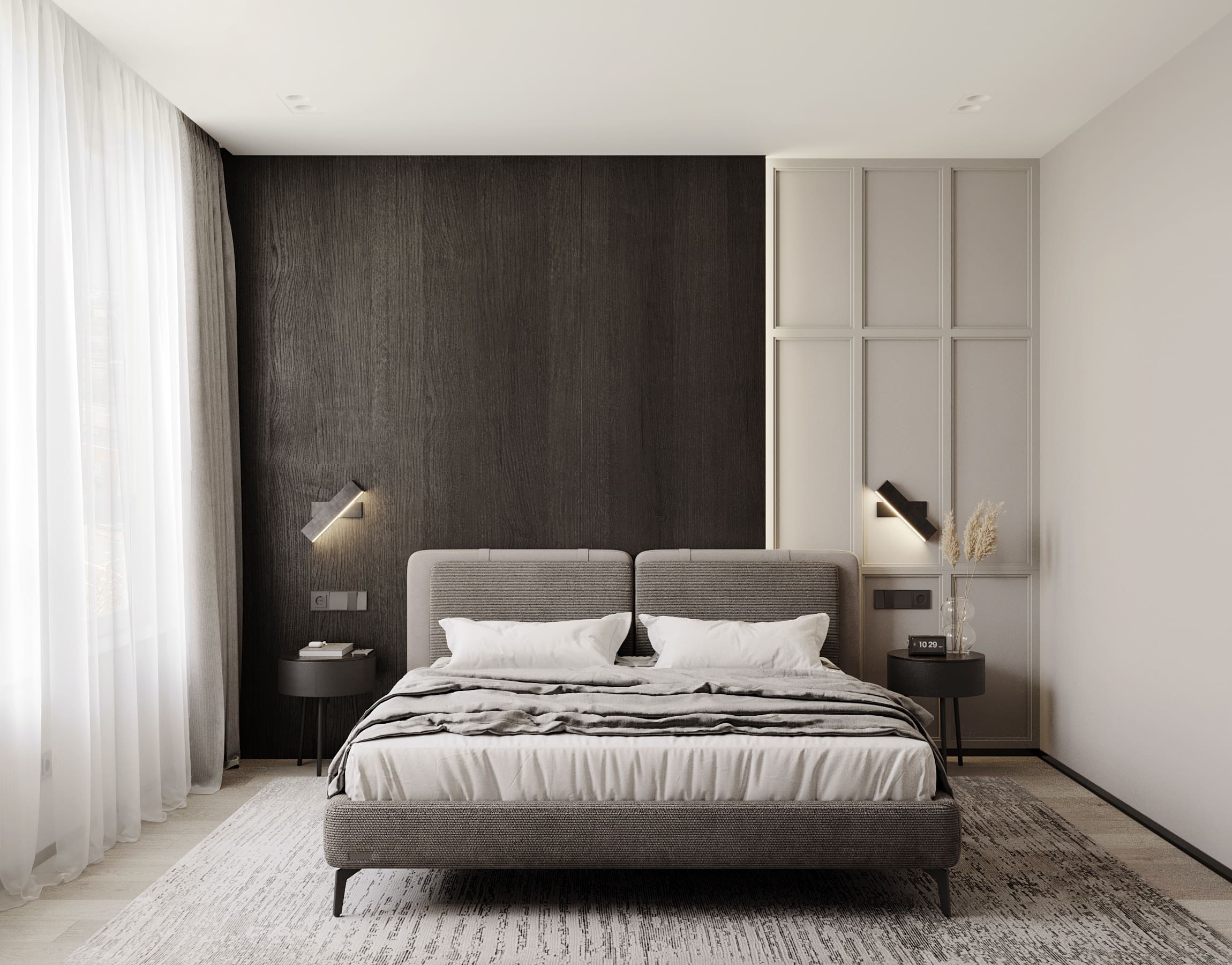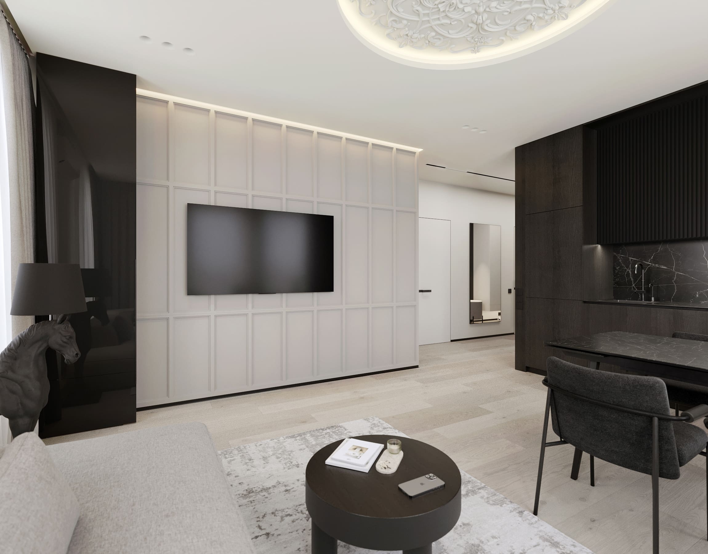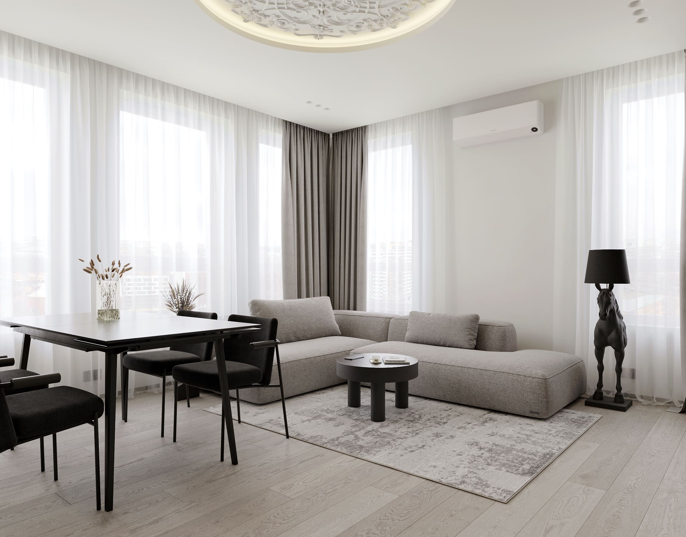 Ця квартира — втілення спокою та вишуканого мінімалізму. Простір, де архітектура поєднується з емоцією, а кожен елемент інтер’єру говорить мовою стилю та балансу. Натуральне світло м’яко проникає крізь напівпрозорі штори, огортаючи інтер’єр теплими відтінками каменю, графіту та піску.