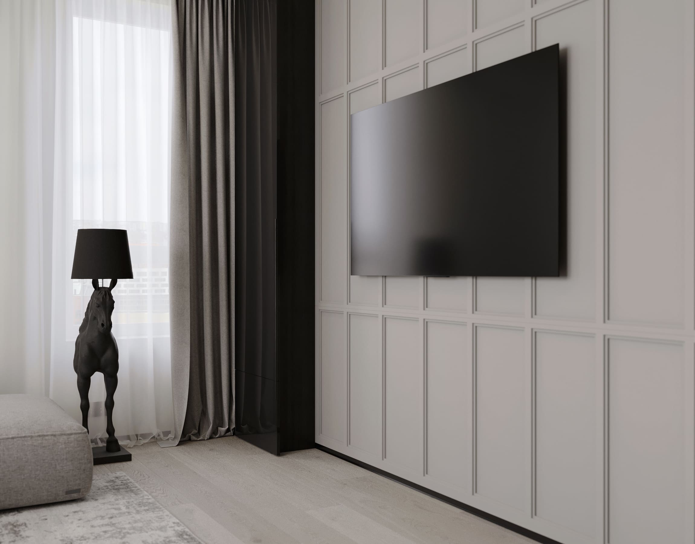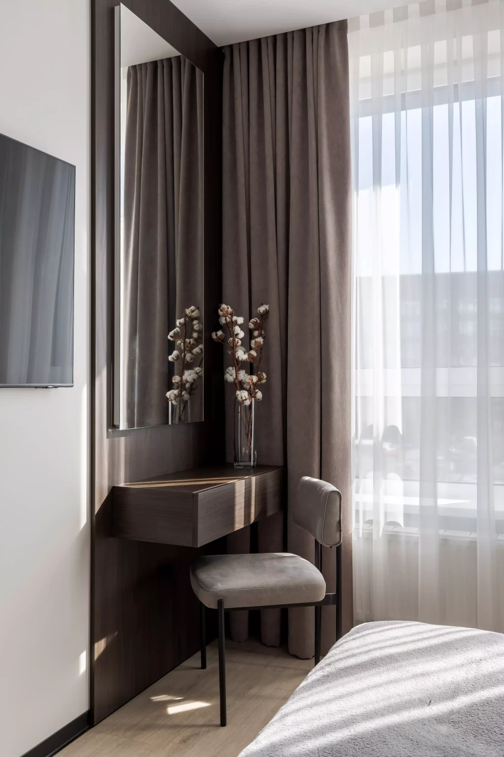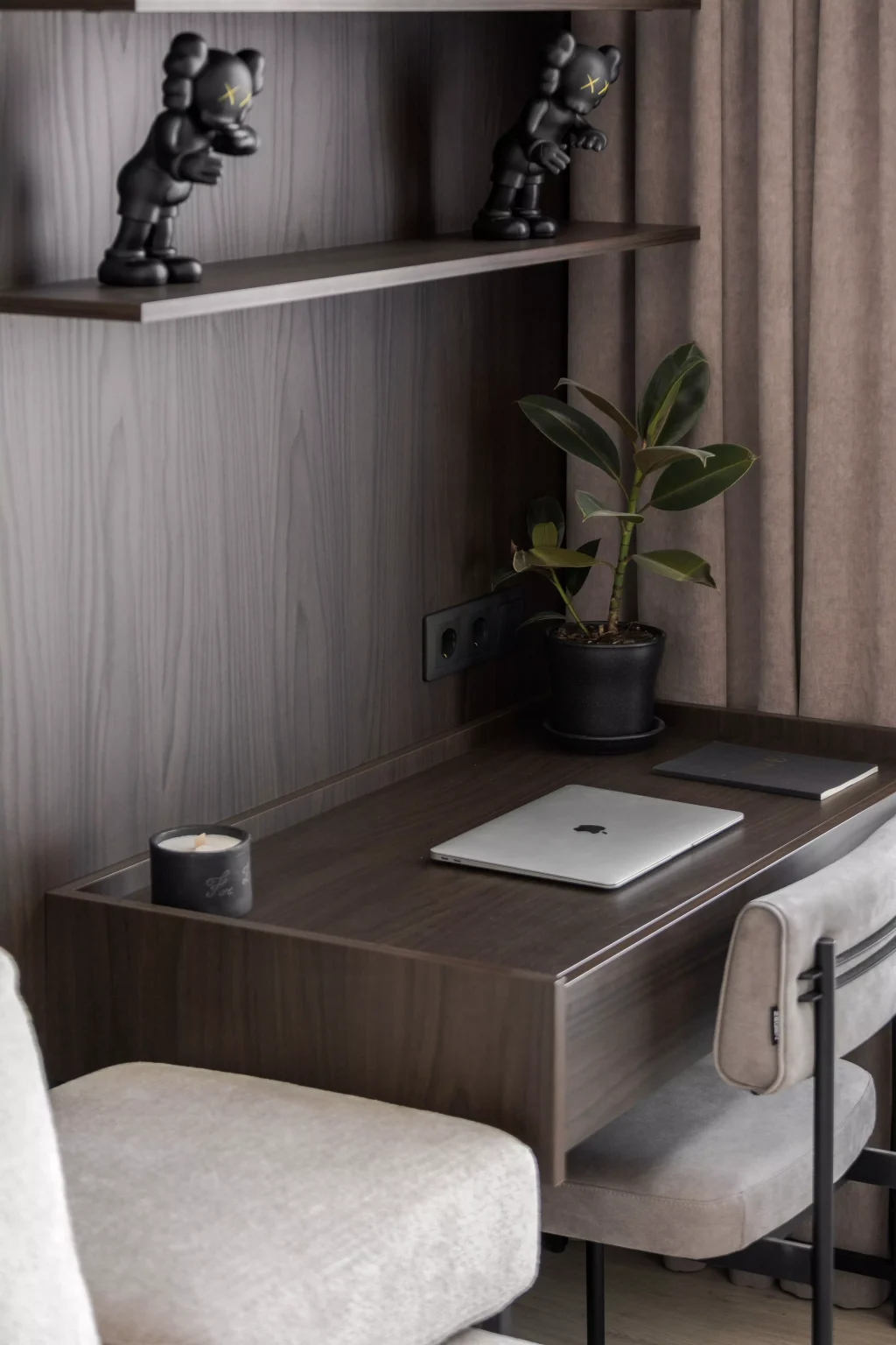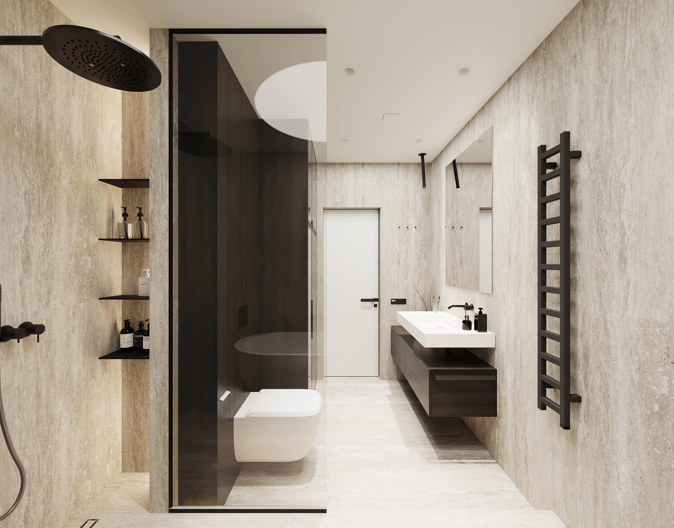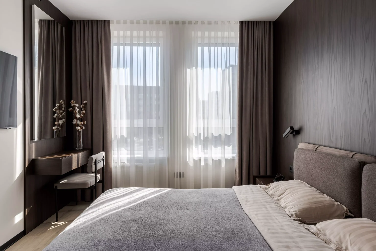 Ця квартира — втілення спокою та вишуканого мінімалізму. Простір, де архітектура поєднується з емоцією, а кожен елемент інтер’єру говорить мовою стилю та балансу. Натуральне світло м’яко проникає крізь напівпрозорі штори, огортаючи інтер’єр теплими відтінками каменю, графіту та піску.