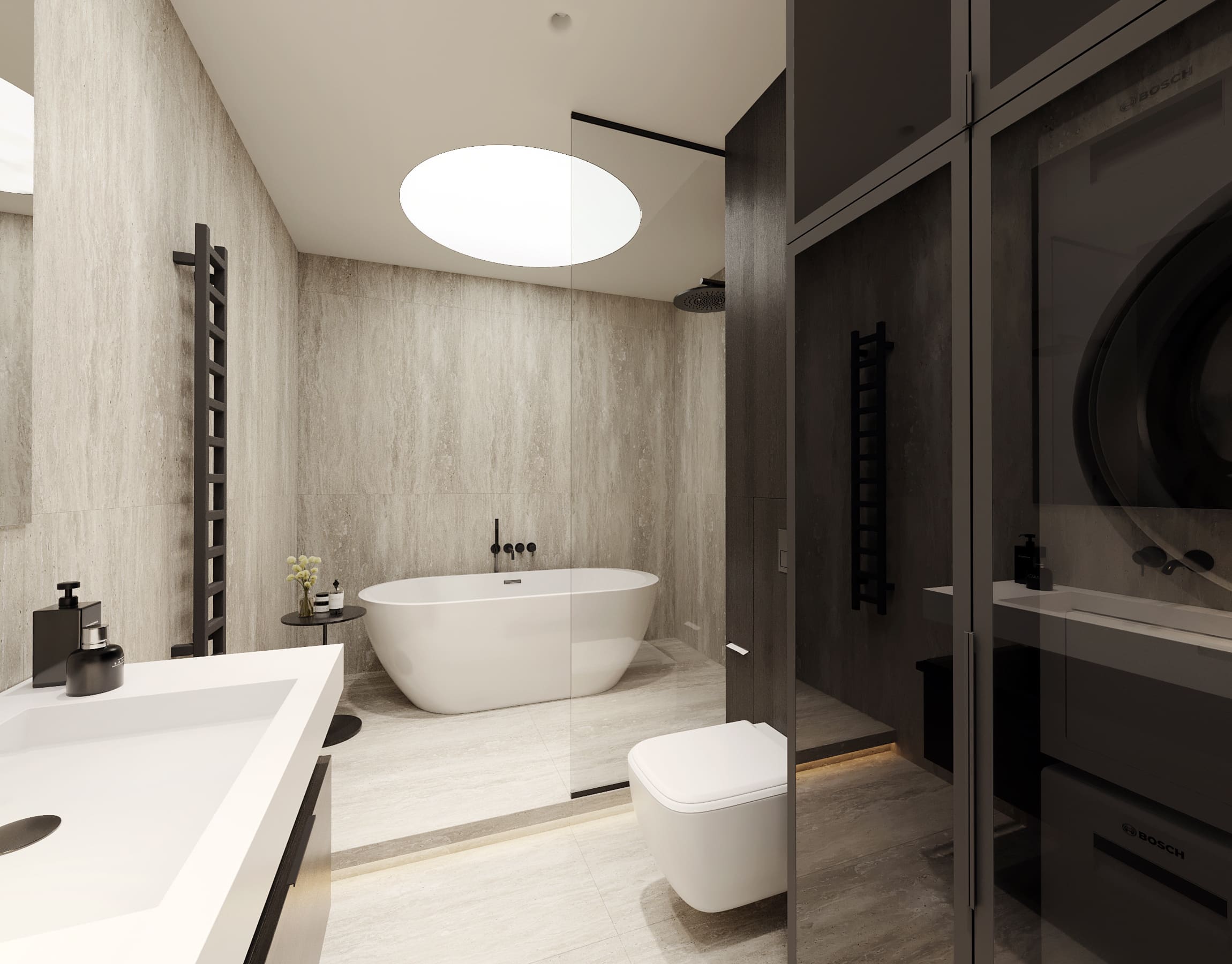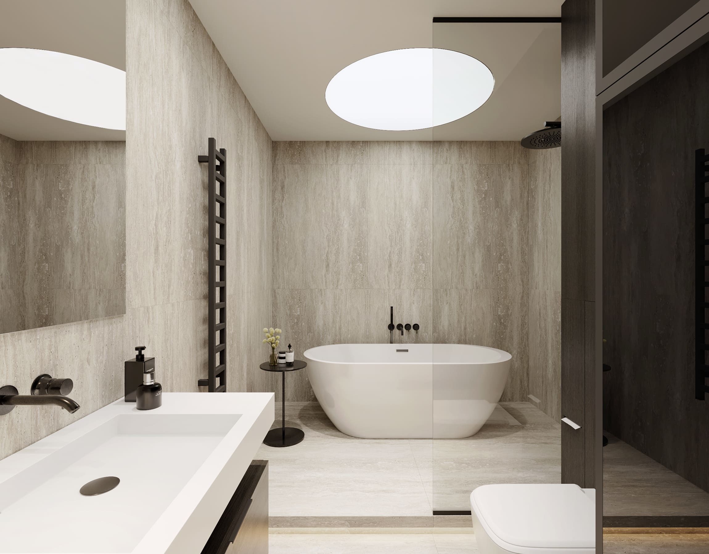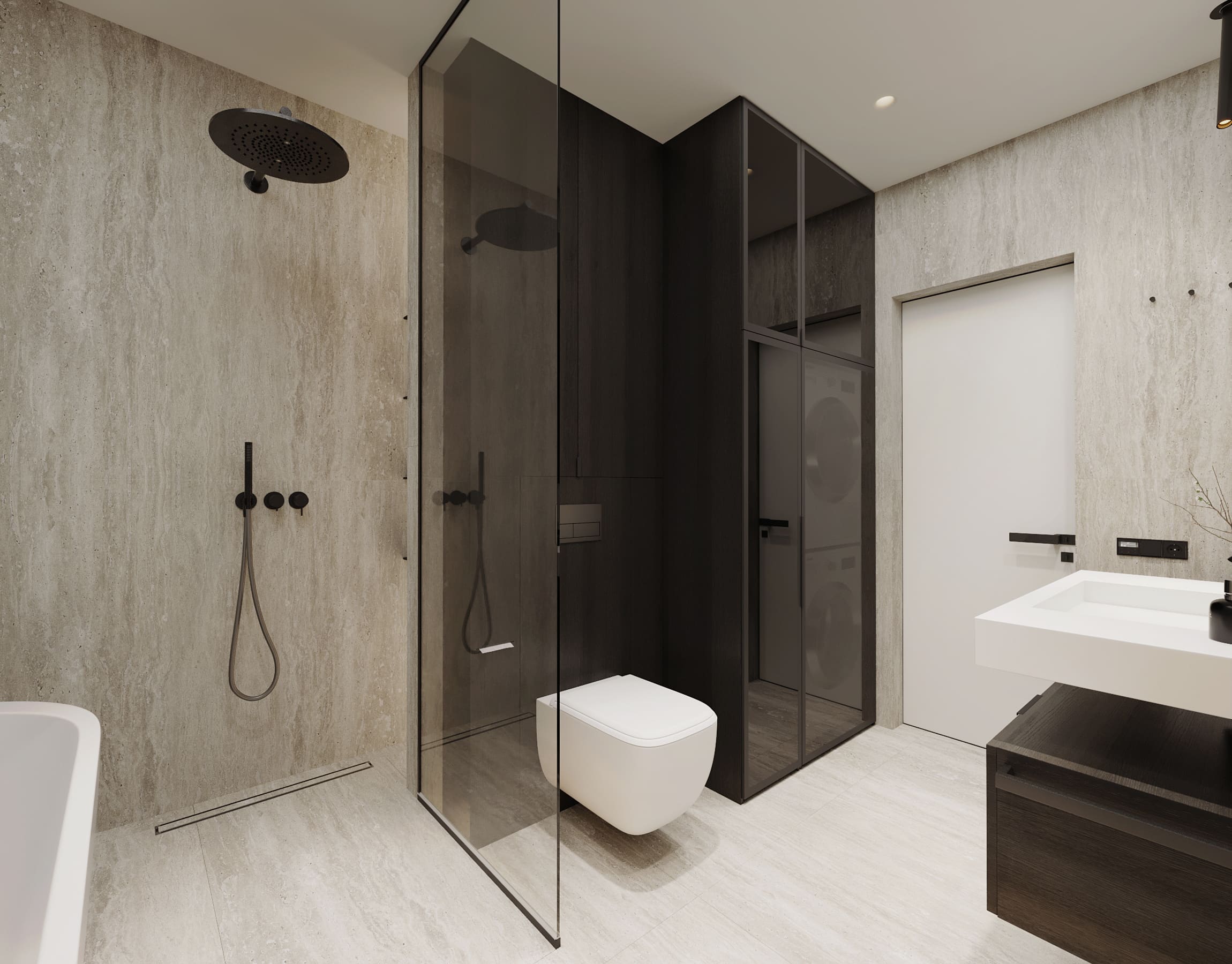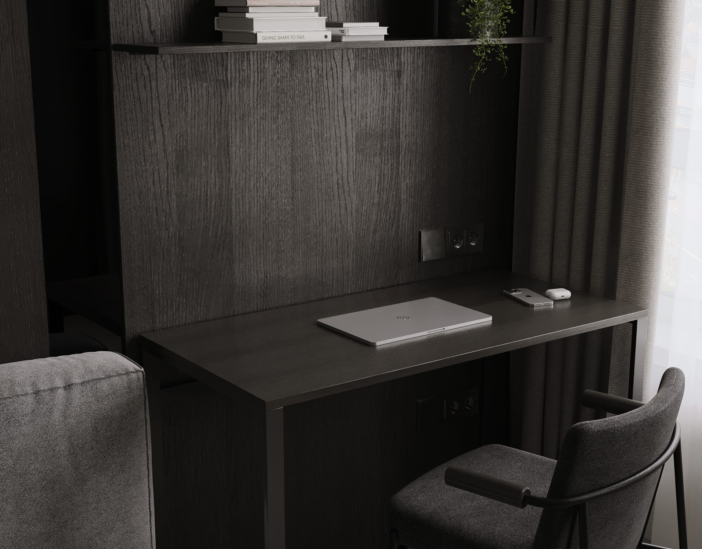 Ця квартира — втілення спокою та вишуканого мінімалізму. Простір, де архітектура поєднується з емоцією, а кожен елемент інтер’єру говорить мовою стилю та балансу. Натуральне світло м’яко проникає крізь напівпрозорі штори, огортаючи інтер’єр теплими відтінками каменю, графіту та піску.