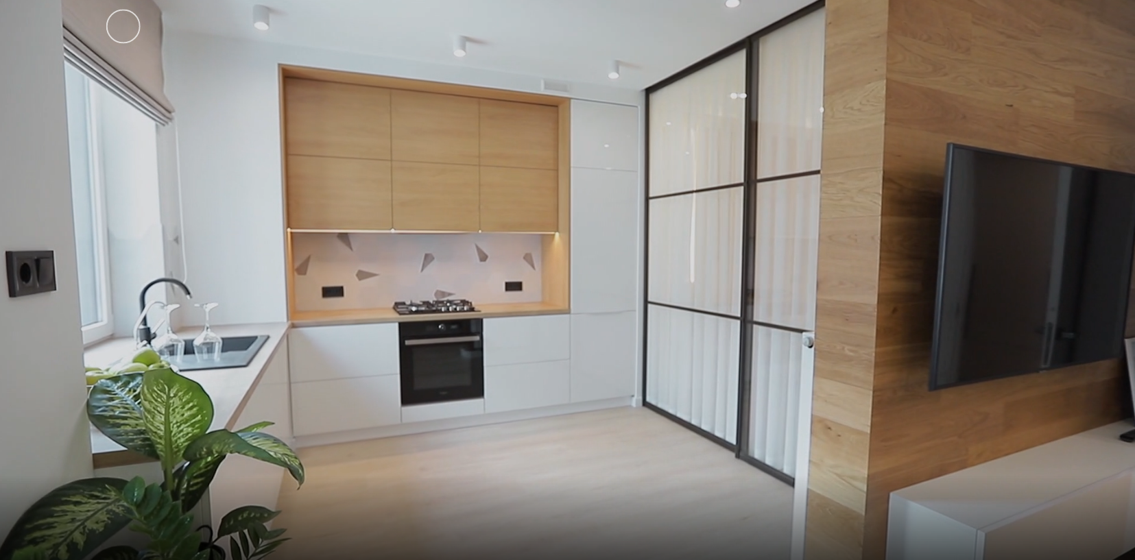 Планування цієї квартири вдалось досить нетиповим. Із зони кухні, через розсувну систему, можна потрапити у маленьку спальню. Таким рішенням вдалось зекономити достатньо площі для простору кухні-вітальні. Так легко уявити себе у цьому житлі! На сімейній вечері за круглим столом із мармуровою столешнею, або ж просто миючи посуд у раковині біля вікна. Ми впевнені, кожен член сім’ї знайде тут щось для себе.