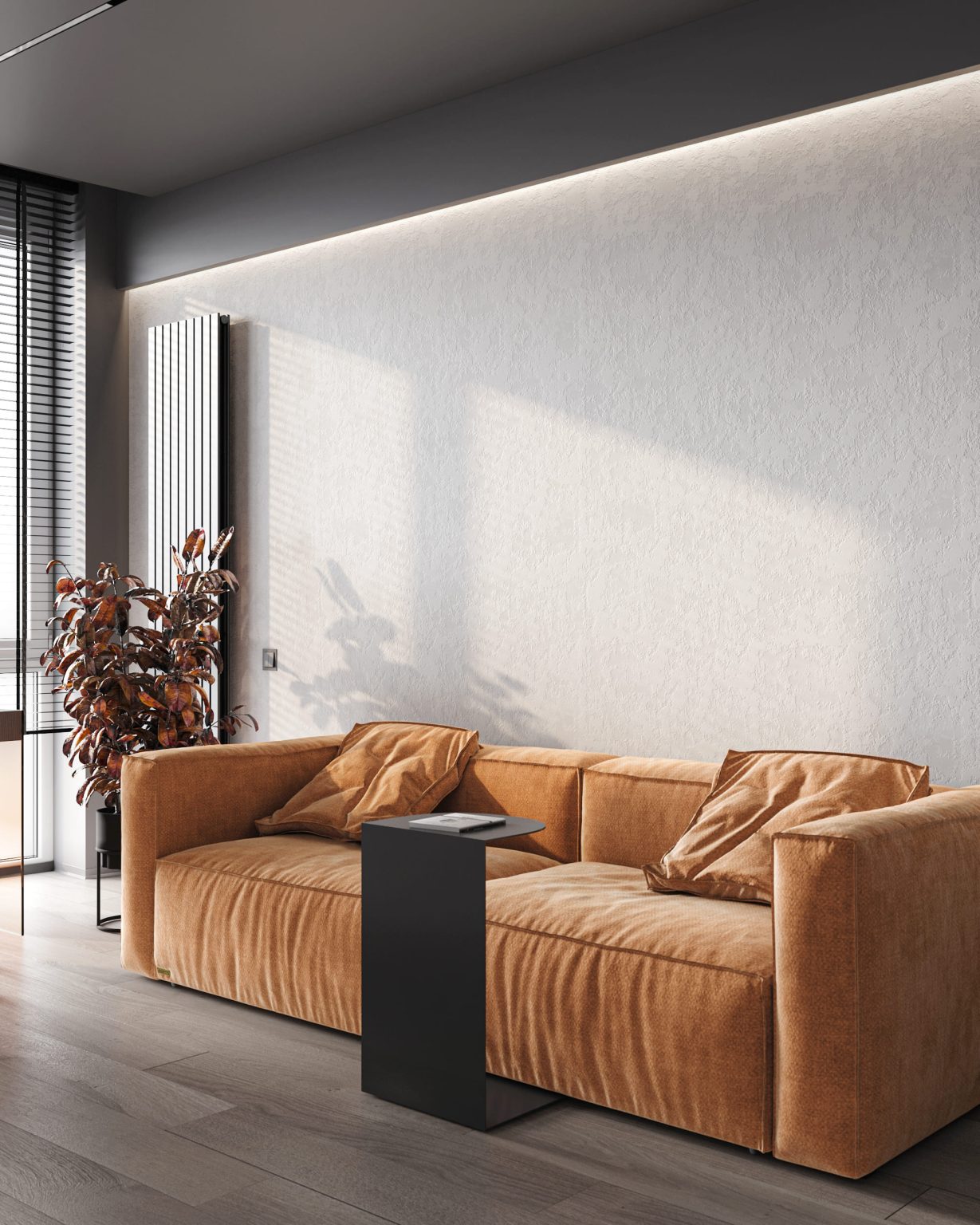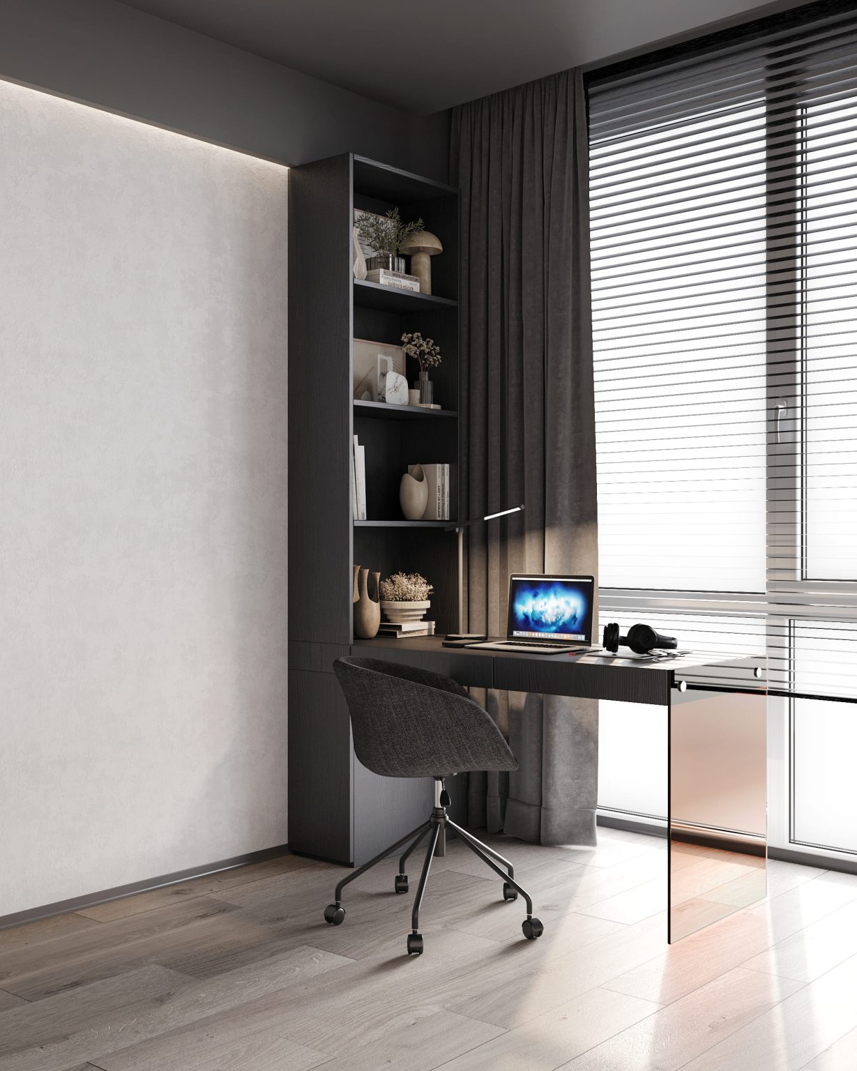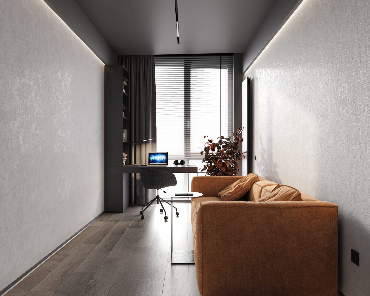 Кабінет — це зона, де має бути мінімум візуального шуму. Тому основний акцент ми зробили на оздоблення стін. Для основи обрали декоративну штукатурку Crystal Decor Marmo Art. А згори пофарбували її інтерʼєрною фарбою Caparol Amphibolin (Granit 25). Розділили їх контурною підсвідкою. Завдяки такому рішенню нам вдалося візуально розширити стелю. У кабінеті передбачено мінімум меблів. Для роботи обрали робочий стіл з полицями. Його особливістю є стійка з гартованого помаранчевого скла. З протилежного боку кімнати розмістили невелику шафу. Для відпочинку обрали акцентний диван Frankof Белфаст. З інших особливостей кабінету: вертикальний радіатор Betatherm Blende.