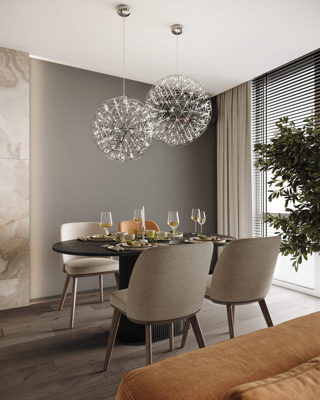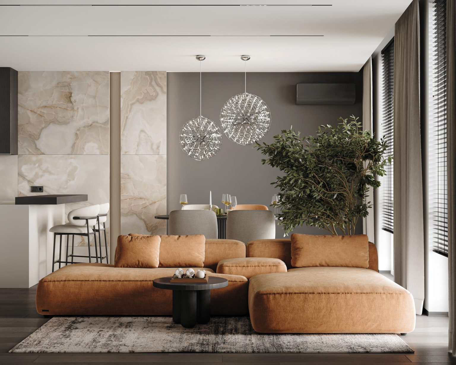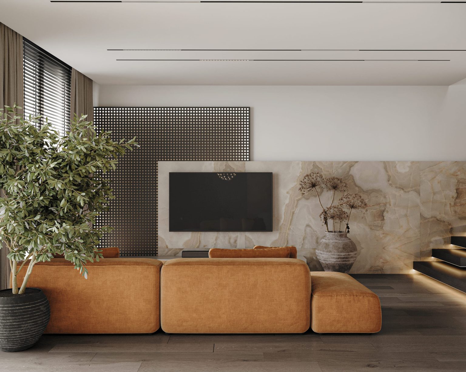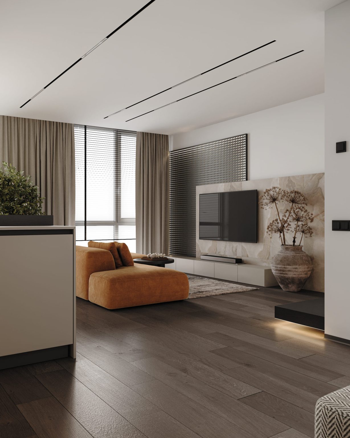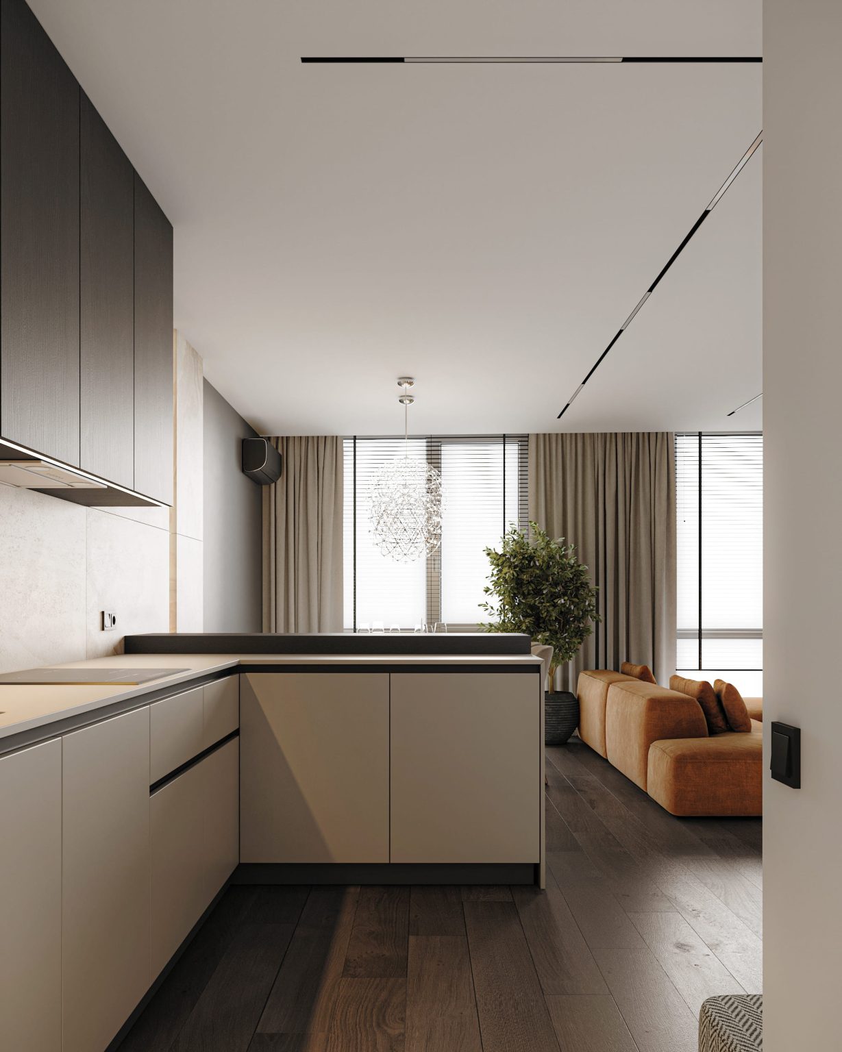 Кухня-вітальня займає основну площу 1 рівня. Готові розповісти про основні особливості. Стіни пофарбовані в темно сірий та молочний кольори. У кухонній зоні наявний меблевий острівний гарнітур та пенали з монтованою побутовою технікою. Стільниця виконана з керамограніту Dekton Aeri Natural. Трохи далі — обідня зона. І прикрашає люстра Robinson Raimond Pendant. Зону вітальні вирізняє акцентний помаранчевий модульний диван Frankof Tasos. Навпроти — стіна з телевізором, яка оздоблена керамогранітом Florim Reves de rex Reve Noisette Glossy та перфорованою панеллю з контурною підсвіткою. Для оздоблення обрали рослинний декор. Для основного освітлення відповідає світлодіодний профіль, змонтований у стелю. Також з вітальні видніються металеві сходи з підсвіткою.