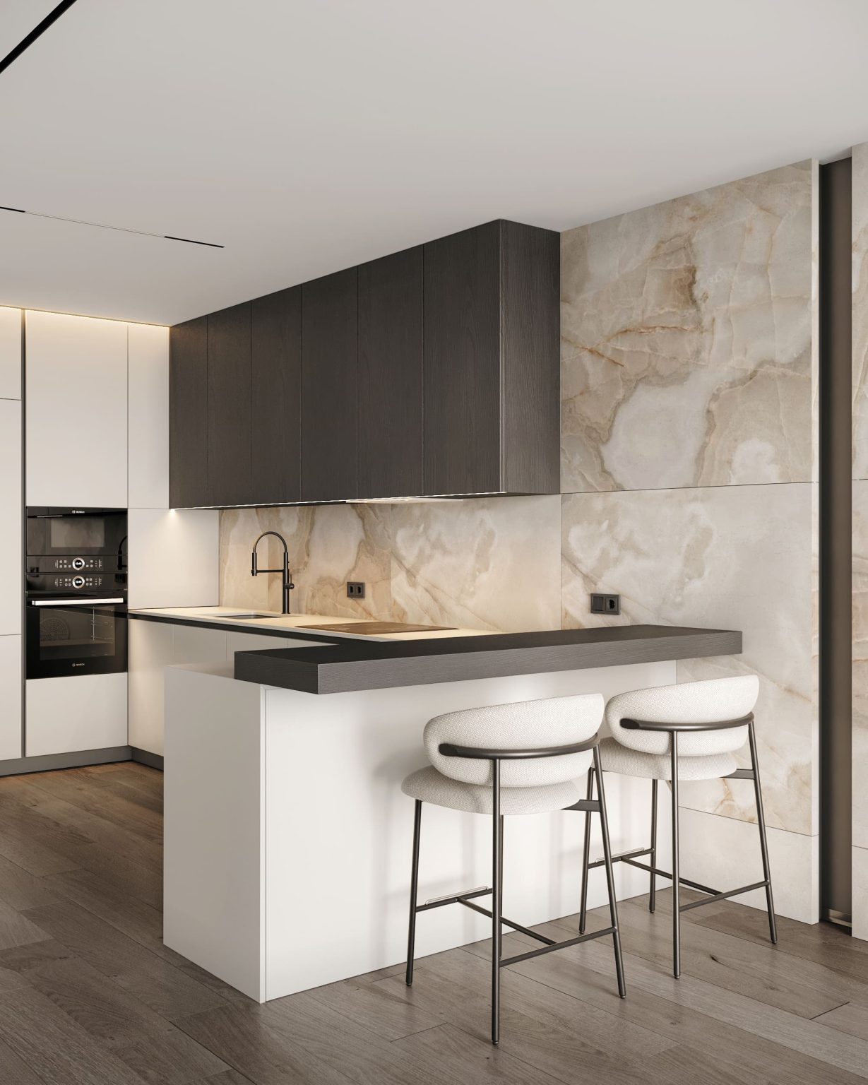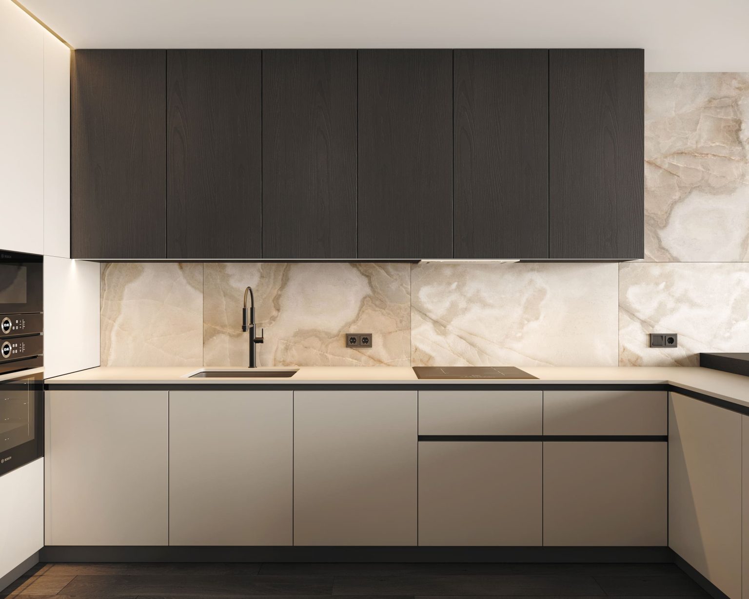 Woo furniture Lake S. Для гри контрастів додали стінову панель з контурною підсвіткою. Для спальні передбачили кілька груп освітлення. За основне світло відповідає LED профіль, додатковими є висячі світильники Anzazo