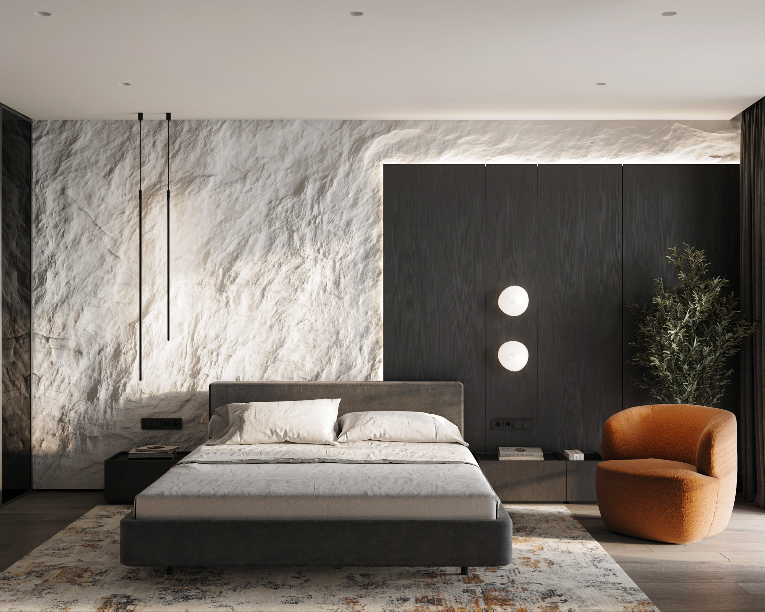 Тут лінійно продовжується загальна тема інтерʼєру: поєднання кольорів на стінах з вкрапленнями помаранчевих меблевих елементів крісло Spin. У спальні зʼявляється текстура, виконана з гіпсу. Її ми розмістили на стіні біля узголівʼя ліжка