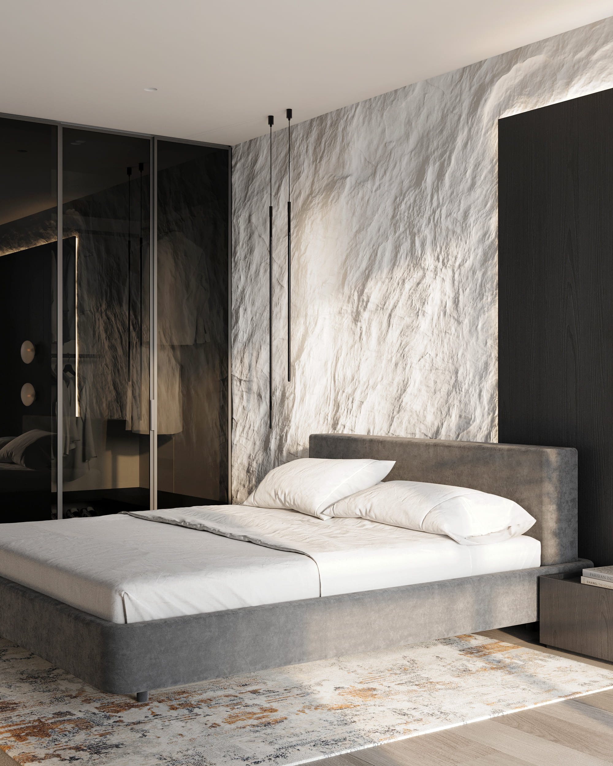Lines 2 та бра Anzazo Pebble Wall. За скляними дверима з розсувним механізмом облаштований гардероб. Тут передбачені зручні полиці, оздоблені контурною підсвіткою.