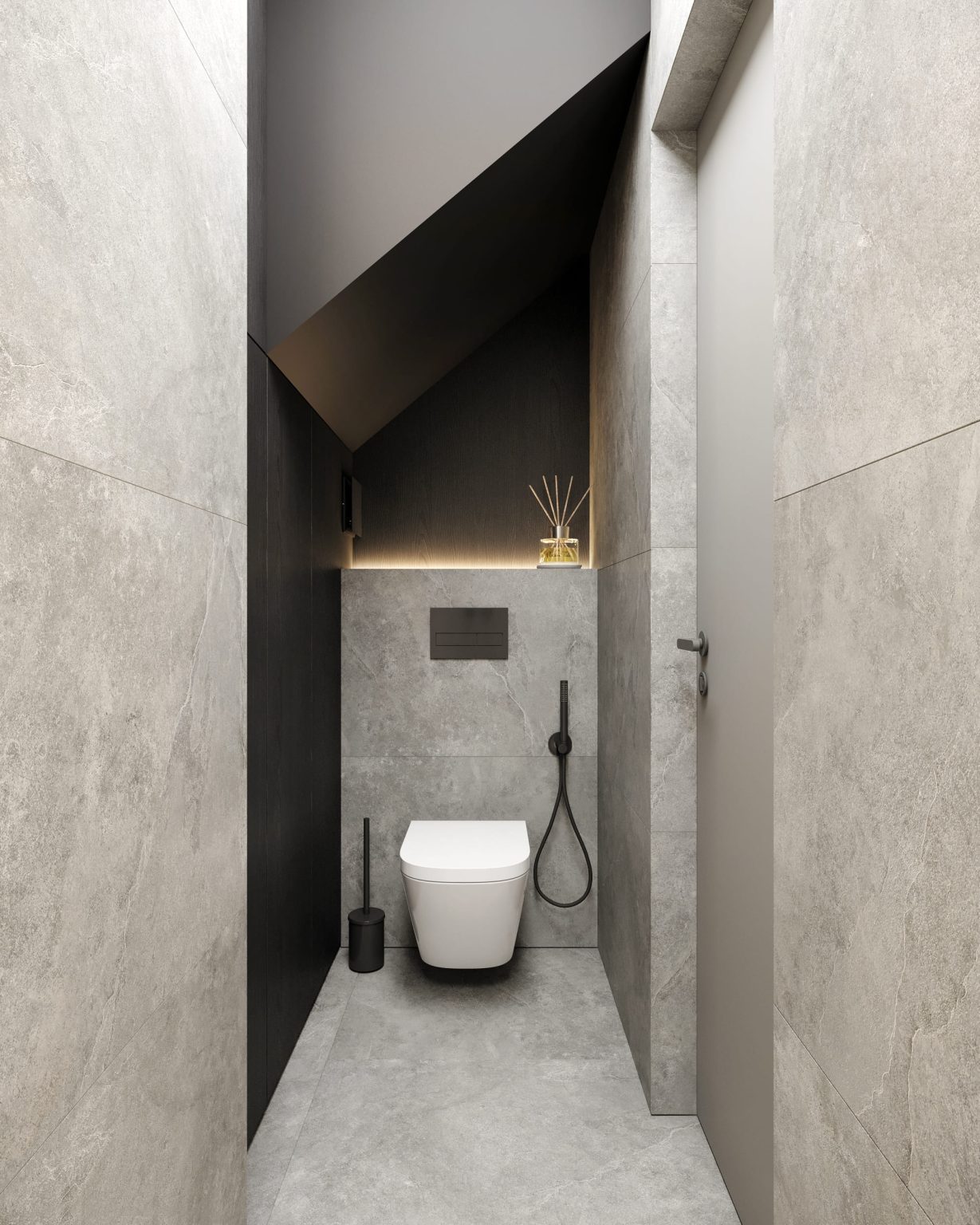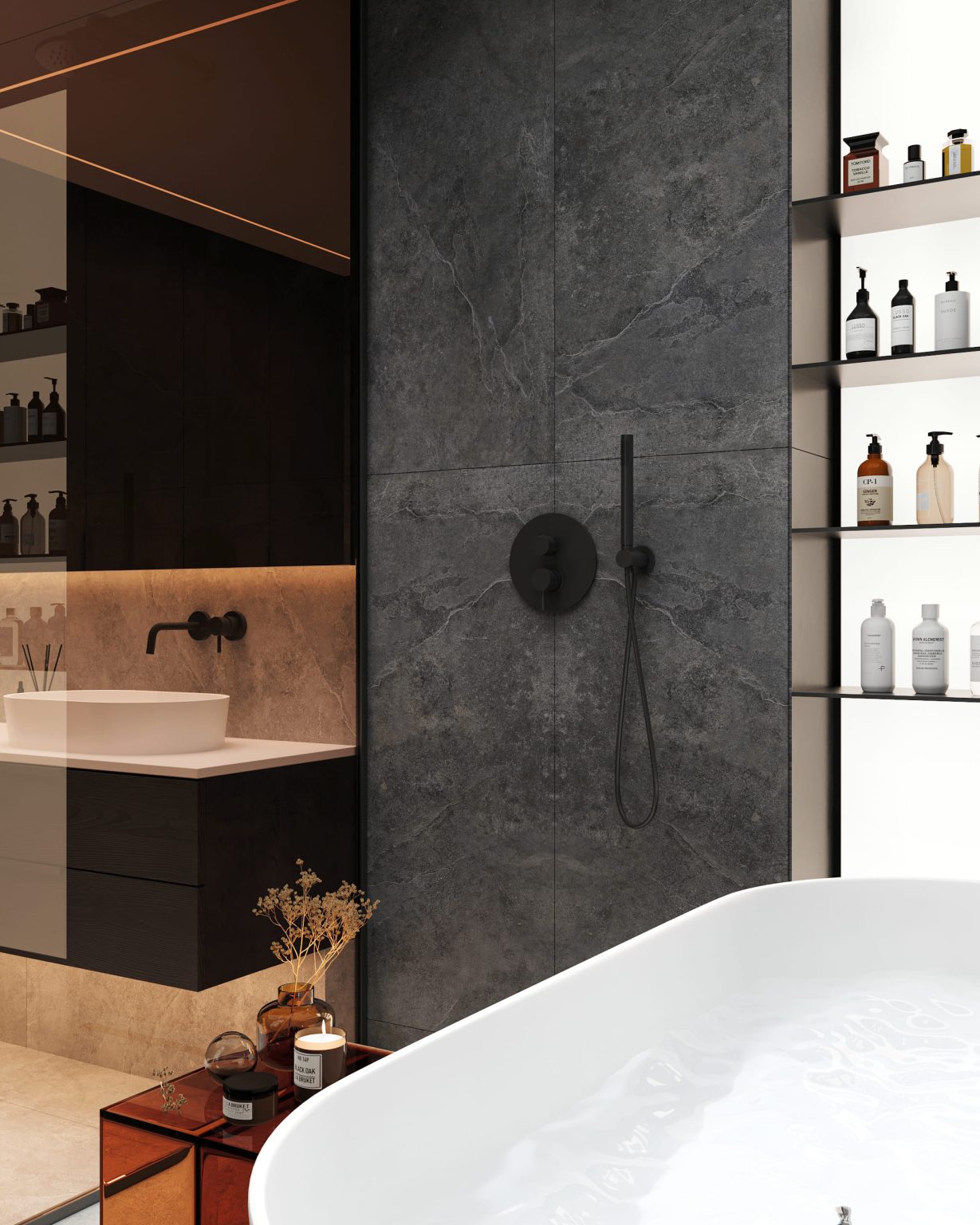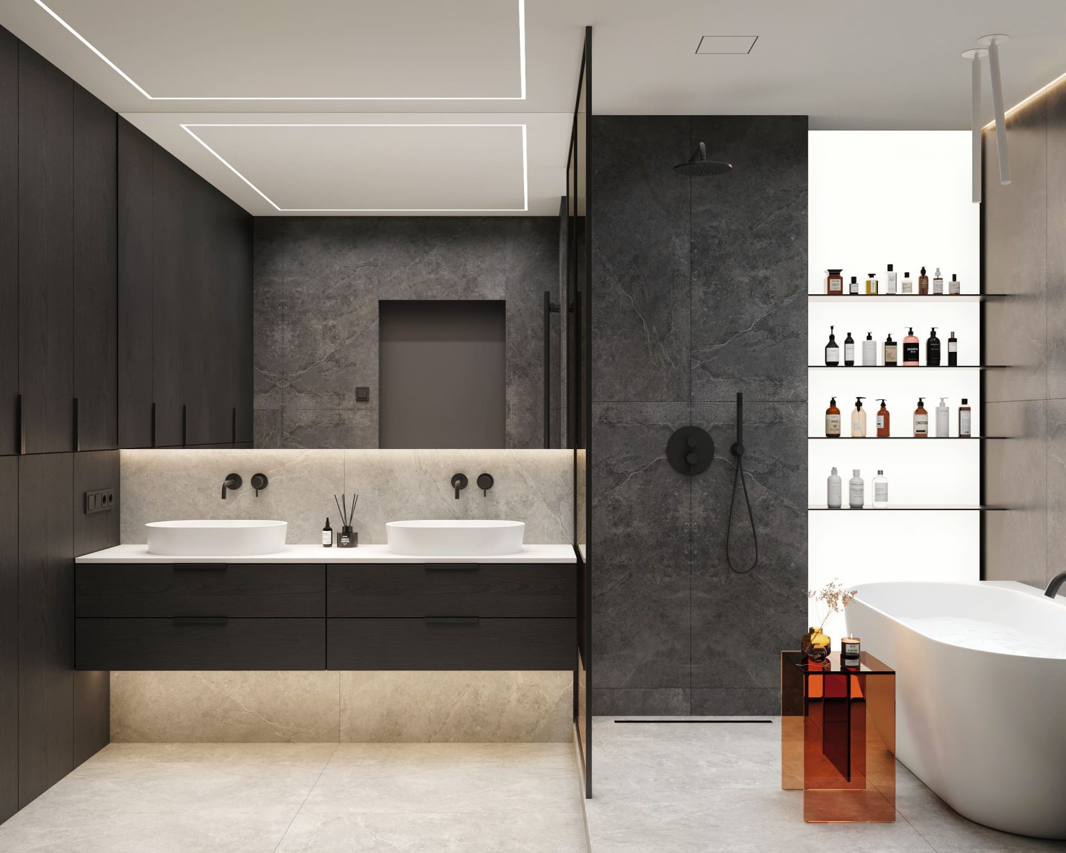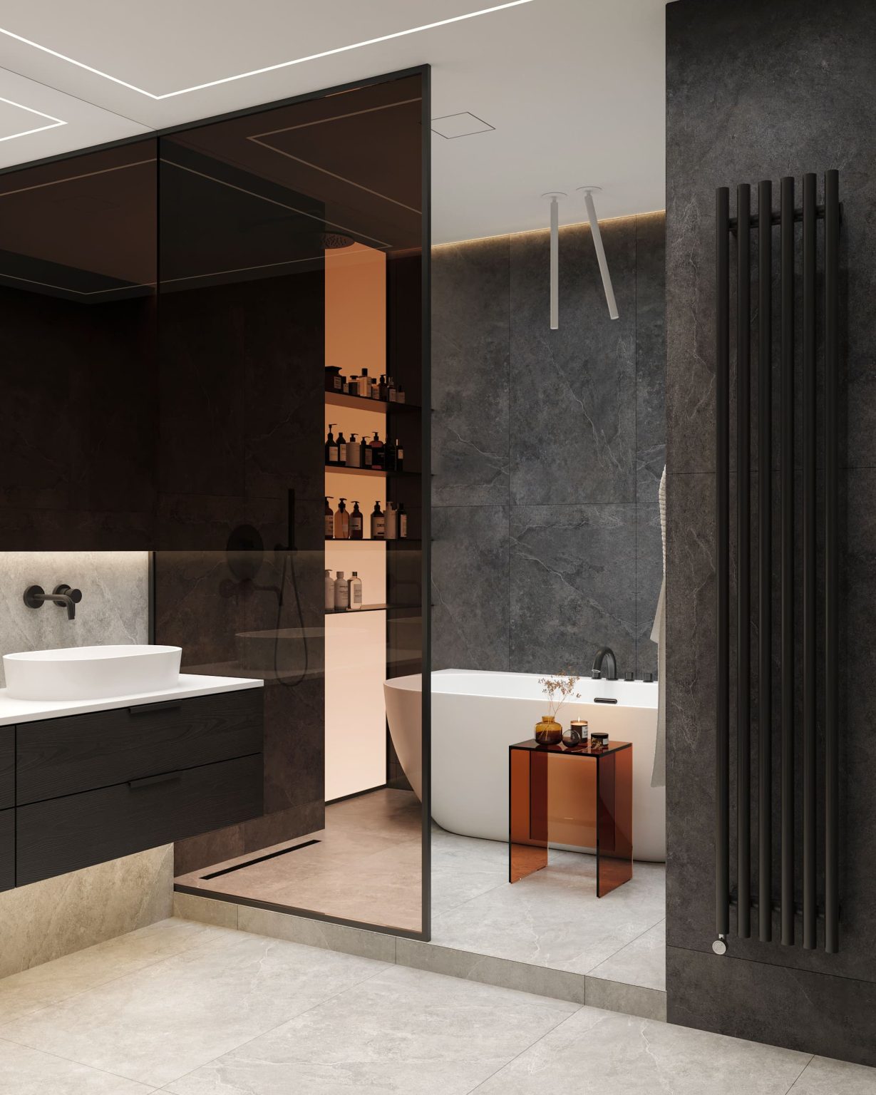 У проєкті передбачено ванну кімнату, площею 8,79 м2, та гостьовий санвузол на 3,30 м2 .Більшою є ванна кімната. Вона вишукана та лінійно продовжує гру контрастів в інтерʼєрі. Стіни оздоблені сірим та молочним керамогранітом від Cerrad Ash Rect. У гостьовому санвузлі на стінах використали лише світлий керамограніт: Cerrad Ash White Rect. Інша частина оздоблена шафою з ДСП панелей. Ванна розділена на кілька зон. Перша: підвісна тумба зі стільницею зі штучного каменю Silestone Iconic white та подвійним умивальником. Також тут вмонтоване дзеркало з контурною підсвіткою. Навпроти — меблевий гарнітур. Друга зона розміщена за помаранчевим тонованим склом. Там облаштований душ та ванна, де родзинкою є світлова стіна з відкритими полицями. Біля ванни ми розмістили столик Kartell Max-Веат, а над нею світильники Nemo Canna. Гостьовий санвузол має лише дзеркало, умивальник з тумбою та сантехніку.