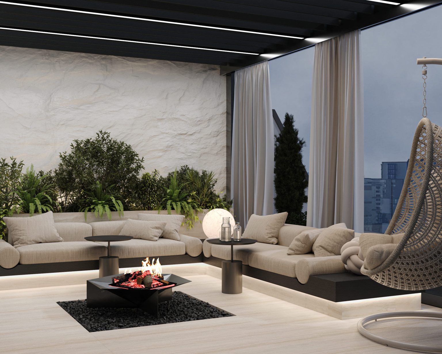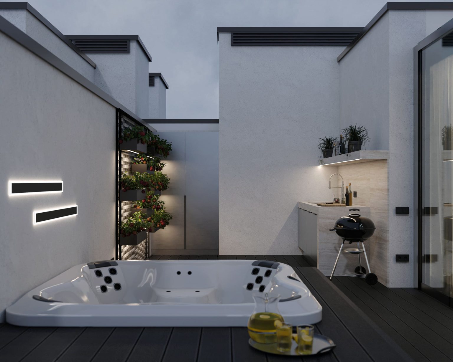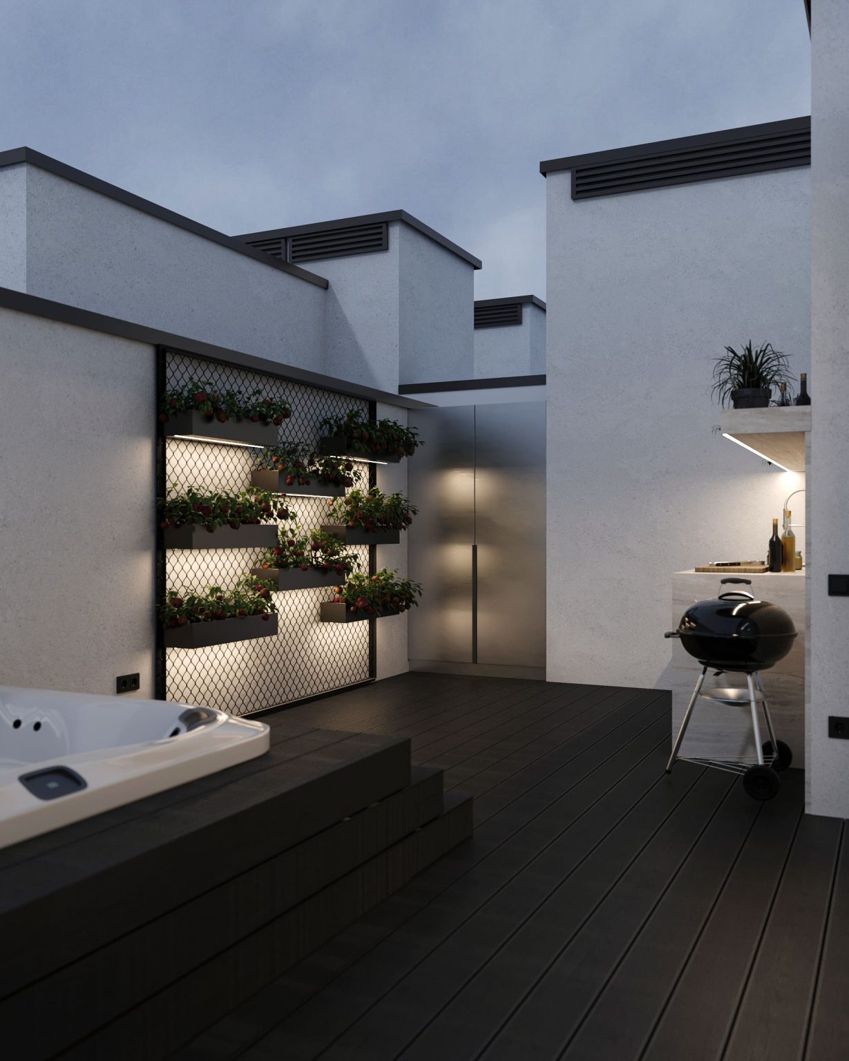 Третій рівень повністю присвячений відпочинку. Для цього тут є три основні зони. Перша - кімната для відпочинку, площею 11,72м. Сюди ми потрапляємо, як тільки підіймаємося на поверх. Саме звідси передбачений вихід на терасу, яка займає всю іншу площу. Вона теж має умовний поділ на дві зони: відкриту й закриту. За панорамними скляними вікнами обладнано простір з мʼякими диванами Livingdivan Kasbah, кріслом-гойдалкою та штучним каміном Hoefats Triple 90. У відкритій зоні для BBQ ми розмістили мінікухню, а родзинкою стало джакузі. Поруч - стенд з живими квітами, закріплений на стіні.