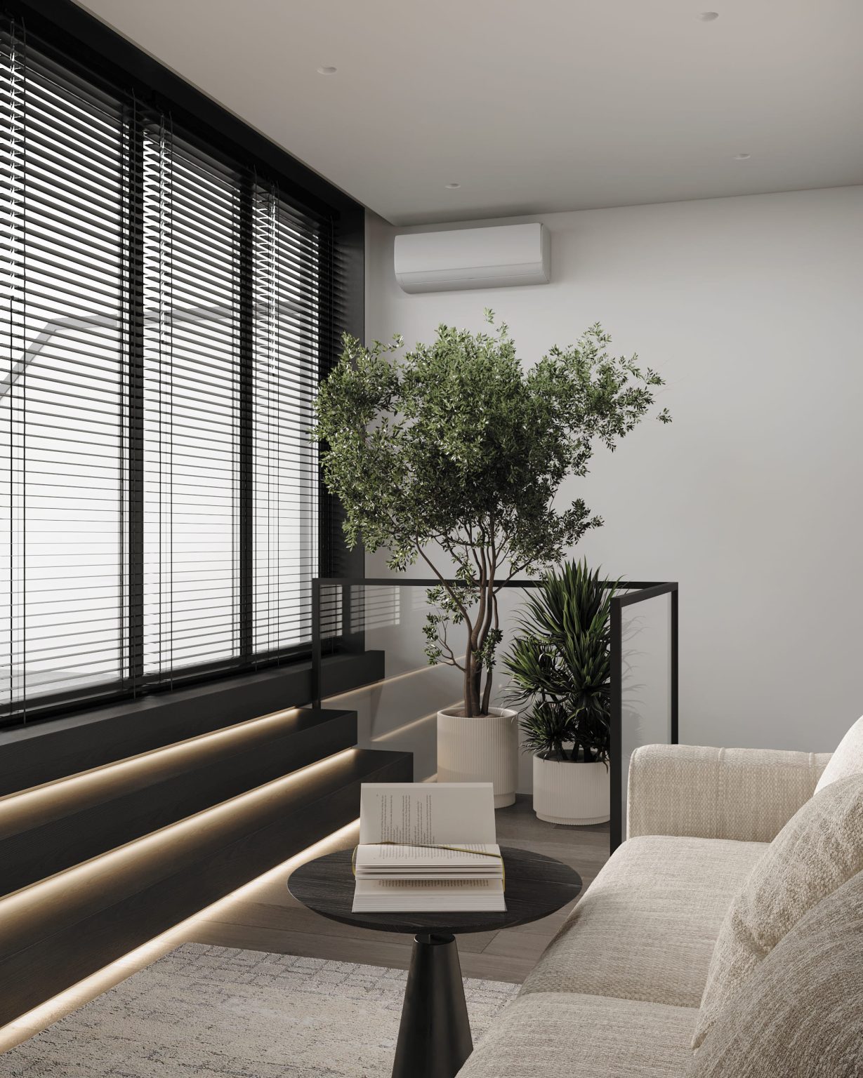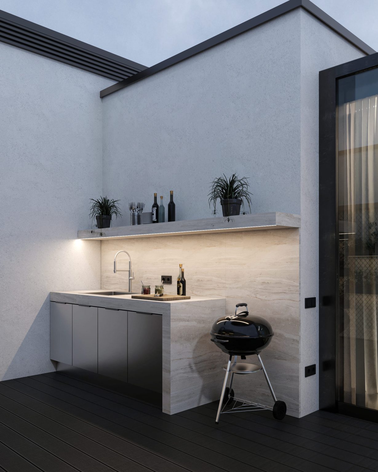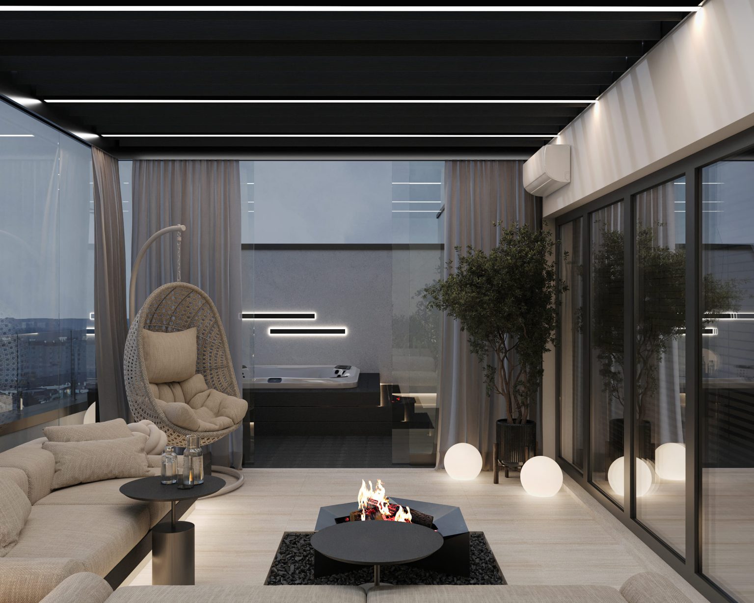 Третій рівень повністю присвячений відпочинку. Для цього тут є три основні зони. Перша - кімната для відпочинку, площею 11,72м. Сюди ми потрапляємо, як тільки підіймаємося на поверх. Саме звідси передбачений вихід на терасу, яка займає всю іншу площу. Вона теж має умовний поділ на дві зони: відкриту й закриту. За панорамними скляними вікнами обладнано простір з мʼякими диванами Livingdivan Kasbah, кріслом-гойдалкою та штучним каміном Hoefats Triple 90. У відкритій зоні для BBQ ми розмістили мінікухню, а родзинкою стало джакузі. Поруч - стенд з живими квітами, закріплений на стіні.